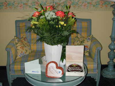 Hotel Alpenrose in Maurach am Achensee Nachdem unser Gepäck auf die Zimmer gebracht und in ausgeräumt ist, denke ich eigentlich, dass es Zeit ist, für unseren traditionellen Spaziergang am ersten Tag. Johanna ist allerdings viel zu müde und so beschließen mein Vater und ich alleine loszuziehen. Es regnet gerade nicht und die Temperatur ist mit 16°C zwar kühl aber nicht unangenehm. Wir laufen also zunächst das kurze Stück nach Eben bis zur Notburga-Kirche, allerdings über die Straße, da wir nicht wissen, wie aufgeweicht die Wiesen nach dem vielen Regen sind. Auf dem Rückweg riskieren wir es dennoch und erstaunlicherweise kann man den Wiesenweg ganz gut laufen. Anschließend schauen wir uns den neuen Supermarkt in der Ortsmitte an und laufen noch eine Runde in Richtung des Ortsteils Lärchenwiese. Kirche der Hl. Notburga in Eben Gegen später treffen wir uns dann alle wieder an der Hotelbar, wo wir uns auf die bevorstehende Woche mit einem ersten Drink einstimmen. Zwischendrin frage ich an der Rezeption nach unserem Tisch und ob das mit der Überraschung geklappt hätte. Die Dame an der Rezeption bestätigt und meint, dass sie das mit den e-mails gewesen sei. Als wir uns nach einer Weile an unseren Tisch bringen lassen, stellt sich zunächst heraus, dass wir den selben Tisch wie bei unserem letzten Aufenthalt bekommen haben. Das mit der Dekoration hat tatsächlich funktioniert: andersfarbige Tischdecke, Platzteller, eine Kerze und eine Geburtstagskarte heben den Tisch aus den anderen heraus. Der Blumestrauß musste leider auf die Anrichte nebenan, weil auf dem Tisch nicht so viel Platz ist. Kaum hingesetzt, serviert der Kellner auch bereits den Sekt, einen österreichischen, der, wie die Weine überhaupt hier in der Alpenrose, ganz hervorragend ist. Johanna freut sich einerseits, andererseits schwört sie mir Rache, weil sie angeblich nicht wollte, dass jeder mitbekommt, dass sie Geburtstag hat. Während des gewohnt guten Essens besucht auch der Hotelchef jeden Tisch und bemerkt natürlich den Unterschied zwischen unserem und den anderen Tischen. Also bekommt Johanna die nächste Gratulation, diesmal sogar mit Handkuss. Nach dem Essen geht plötzlich das Licht aus. Ich denke in der ersten Sekunde an einen Stromausfall, dann fällt mir aber ein, dass ja noch ein Gruß aus der Küche avisiert worden war. Und tatsächlich kommen drei der Bedienungen mit einem Feuer sprühenden Kästchen an unseren Tisch. In dem Holzkästchen befindet sich eine kleine Geburtstagstorte. Johanna erhält weitere Gratulationen, Bussies und ein Polaroidfoto, dass in die Geburtstagskarte eingeheftet wird. Das Essen beschließen wir dann mit einem Ziegler Aprikosenbrand und ziehen noch für ein Bier an die Bar um.