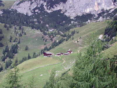 Zunächst laufen wir wieder zurück zur Erfurter Hütte an der Bergstation der Rofanbahn. Wir verabschieden uns von Johanna, die mit der Bahn zurück fährt. Mein Vater und ich machen uns auf den Weg hinunter zur Buchauer Alm. Dieses Stück ist recht steil und wir sind froh, die Wanderstöcke dabei zu haben.
