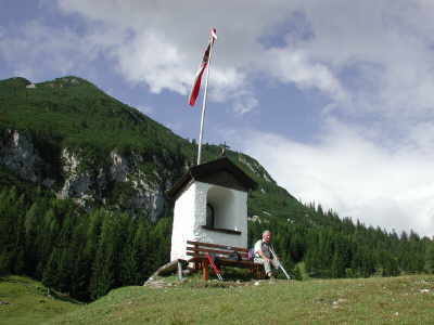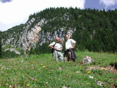Nachdem wir den Flüssigkeitshaushalt wieder auf ein erträgliches Niveau gebracht haben, machen wir uns an den Abstieg. Das ist eigentlich anstrengender als der Aufstieg, da es ständig bergab geht. Knie und Beine insgesamt werden dadurch stark belastet. Auf Höhe von Eben benutzen wir dann den Waldweg nach Maurach, der in ständigem Auf und Ab an der Straße entlang bis Maurach führt.