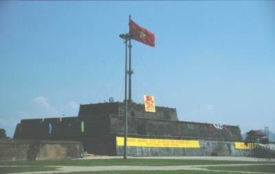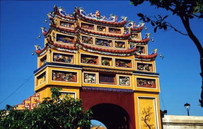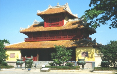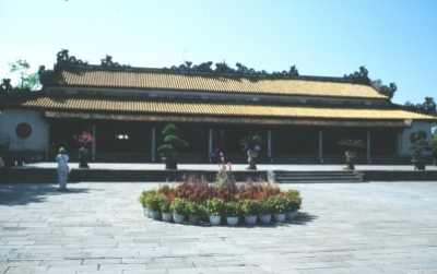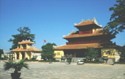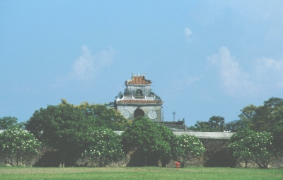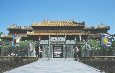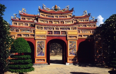 Zur Stärkung vor der nächsten Besichtigung bestellen wir im Restaurant des Hotels eine Nudelsuppe mit Hühnchen. Während wir warten, beobachten wir ein italienische Reisegruppe, die gerade ihr Steak mit Pommes Frites serviert bekommt! Unsere Nudelsuppe ist ein Reinfall, da praktisch kein Gemüse enthalten ist und das Hühnchenfleisch im wesentlichen aus Haut und Abfall besteht, was Johanna anschließend der Kellnerin auch zu verstehen gibt. Im Bus müssen wir dann mehr als eine Viertelstunde auf einen Mitreisenden warten, der erst seinen Koffer spät bekommen hat und dann auch noch spät sein Mittagessen bestellt hat. Unser Kölner steigert sich immer mehr in ein „Steinigt ihn“-Stimmung hinein, die Johanna durch den Vorschlag, das der Verspätete eine Runde Reisschnaps ausgeben müsse, entschärft. Schließlich fahren wir in Richtung Zitadelle und Kaiserpalast los. Nach dem etwas trüben Wetter in Hanoi macht der Sonnenschein hier in Hue trotz der Hitze doch mehr Laune. Insbesondere auch deshalb, weil die Farben der Hallen und Tore sehr viel besser zur Geltung kommen. Die Fotografen in der Gruppe, also auch ich, haben alle Mühe, einerseits den Erklärungen des Reiseleiters zu folgen und andererseits die zahlreichen Motive einzufangen.
