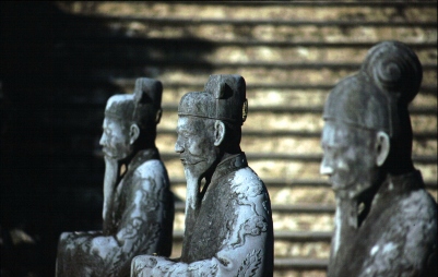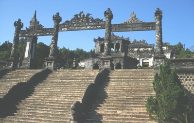 In einem relativ bergigen Gebiet erreichen wir schließlich das Grabmal von Kai Dinh, der als zwölfter Kaiser von 1916-1925 regierte. Das Grabmal ist einen Hang hinaufgebaut. Über zwei relativ steile Treppenabschnitte kommt man auf eine Plattform mit einem Pavillon und einer steinernen Ehrengarde.