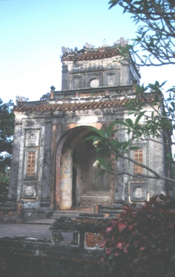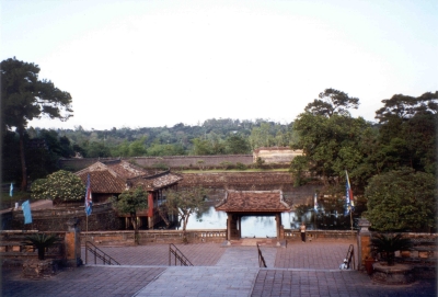 Man kann nun wirklich darüber streiten, ob das Mausoleum nun kitschig oder misslungen ist, interessant ist es aber auf jeden Fall. Während wir die Stufen hinunter zum Bus laufen, zieht sich der Himmel etwas zu. Zusammen mit der Tatsache, dass es bereits relativ spät ist, ergibt das keine guten Aussichten für die Besichtigung des Grabmals von Kaiser Tu Duc, der als vierter Kaiser des Nguyen-Dynastie von 1847-1883 regierte. Der Kaiser war wohl trotz seiner 103 Ehefrauen und zahllosen Konkubinen nie glücklich gewesen. Nicht nur, weil er wegen einer Krankheit kinderlos geblieben war. Anscheinend war ihm viel mehr an Musik, Dichtkunst und Natur gelegen, als am Regieren. So wundert es nicht, dass sein Grabmal wie ein Stück Landschaft in der Landschaft angelegt wurde.