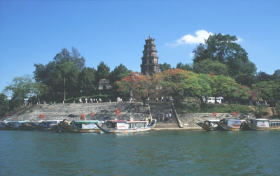 Zunächst ist nur der 1844 errichtete Phuoc Duyen-Turm zu sehen. Der 21m hohe, achteckige Bau gilt als das inoffizielle Wahrzeichen von Hue. Von hier oben hat man einen sehr schönen Blick über den Fluss und die Landschaft dahinter, die allmählich in Bergland übergeht.