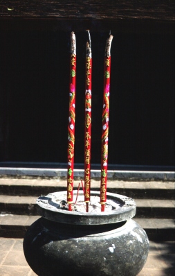 Nach dem Frühstück geht es dann erst einmal in Richtung der Thien Mu-Pagode. An der Straßenkreuzung hinter der Brücke über den Parfümfluss dann plötzlich Aufregung. Menschen schauen, Polizei steht umher, Nirgends sind jedoch verunglückte Autos oder Mopeds zu entdecken. Den Grund für die Aufregung sehe ich nur für wenige Sekunden, als auf einer Rikscha ein verbrannter Körper vorbei gefahren wird. Der rechte Arm steht nach oben, der Unterarm ist nach vorne abgewinkelt. Der ganze Körper sieht aus, wie mit Asche überzogen. Unser Reiseleiter meint, dass die Selbstverbrennung in Vietnam eine „gebräuchliche“ Form des Selbstmordes sei. Des öfteren komme es vor, dass sich Menschen, die nach verlorenen Wetten keinen Ausweg mehr sehen, selbst töten.