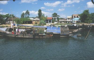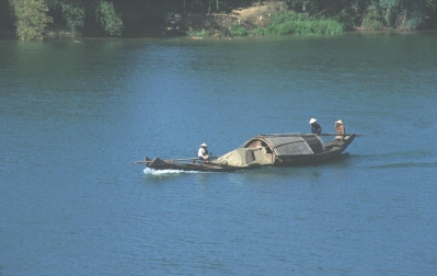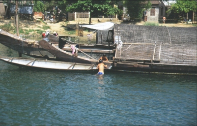 Unten am Fluss wartet schon unser Drachenboot, auf dem es zurück Richtung Hue geht. Wie üblich hier, gibt es natürlich Souvenirs zu kaufen, worauf nach dem Löschen des ersten Durstes die meisten Frauen der Gruppe wie beim Sommerschlussverkauf in den T-Shirts, Blusen, Morgenmäntel etc. zu wühlen beginnen. Das endet auch erst beim Verlassen des Bootes am Hotel. Wir haben inzwischen ein paar Postkarten und Johanna zwei Blusen gekauft. Während der Fahrt sehen wir auch ein Boot, auf dem Arbeiter mit der Gewinnung von Flusssand beschäftigt sind. Ein Abstecher führt uns in ein Fischer“dorf“, in dem die Menschen auf Hausbooten leben.