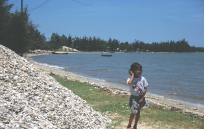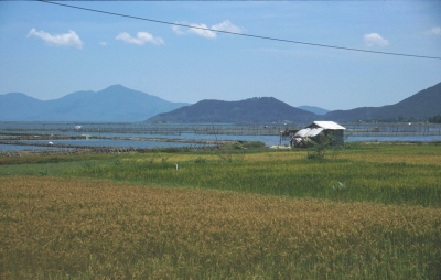 Die N1, die Saigon mit Hanoi verbindet verläuft hier nach kurzer Zeit zwischen Meer auf der einen und den Bergen auf der anderen Seite. Dazwischen reife und teilweise abgeerntete Reisfelder. In der riesigen Brackwasserlagune hinter Hue werden heute Muscheln und Shrimps gezüchtet. Auch hier machen wir wieder einen kurzen Fotostopp.