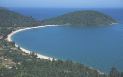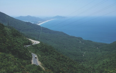 Bei der Fahrt über die zwei kleineren Pässe Phu Gia und Phuoc Tuong (Pass des Wohlstands und Pass des glücklichen Elefanten) öffnet sich der Blick immer wieder auf die grüne Landschaft im Vordergrund und das strahlend blaue Meer im Hintergrund.