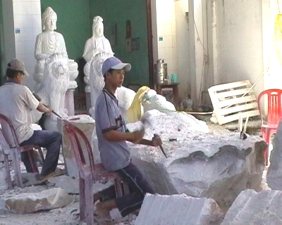 Am Rande von Da Nang ragen fünf Felskegel aus der Ebene. Hier wurde früher Marmor abgebaut und vor Ort verarbeitet. Inzwischen ist der Abbau hier eingestellt. Der Marmor, der in den zahlreichen Werkstätten um die Marmorberge zu großen Löwen, Drachen, Gartenlampen etc. verarbeitet wird, kommt mittlerweile aus Nordvietnam. Natürlich besichtigen wir eine der Werkstätten, wo Steinmetze an riesigen Marmorblöcken arbeiten. Die ausgestellten Stücke sind per se alle zu groß, als dass sie uns interessieren könnten. Die kleinen Stücke sind nicht so interessant, als dass wir Kauflust bekämen.
