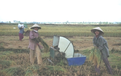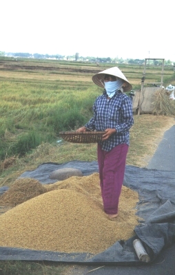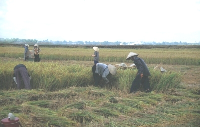 Nach einer kurzen Strecke auf der N1 biegen wir auf die Straße nach My Son ab und kurze Zeit später beginnt auch die Baustelle. Faktisch wird da über 30 km eine neue Straße gebaut. Nun ist es aber nicht so, dass man auf einer Umleitung oder so fahren würde, das allenfalls bei einigen wenigen Brückenbauten. Ansonsten fährt man die ganze Zeit in der Baustelle, an der allerdings auch nicht überall gearbeitet wird. Der Straßenbau zieht sich durch Dörfer und das Land. Zwischendurch haben wir dann auch noch die Möglichkeit, Reisbauern bei der Arbeit auf dem Feld zu beobachten und zu fotografieren.