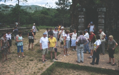 Nach etwa 2,5 Stunden sind wir am Ende der Straße bei Kassenhaus für das Gebiet der Cham-Türme angelangt. Von hier aus überqueren wir einen jetzt ausgetrockneten Flusslauf auf einer Bambusbrücke, die allerdings mit Betonbrückenpfeilern und Stahlträgern „entschärft“ wurde. Dahinter heißt es dann auf die Jeeps und den Kleinbus zu warten, mit denen das nächste Stück, angeblich 2.5 km, überwunden werden sollen. Da noch immer eine dicke Wolke die Sonne verdeckt und die Temperatur dadurch nicht ganz so hoch ist, entschließen sich ein paar Leute, das Stück zu Fuß zu gehen. Ich schließe mich dieser Gruppe an. Am Endpunkt dieses Streckenabschnittes kommen wir tatsächlich kurz vor dem Rest der Gruppe an. Inzwischen hat sich die Wolke wieder verzogen und es wird schlagartig sehr heiß. Nach 200 m zu Fuß erreichen wir den Bereich innerhalb des Tales, in dem die wenigen nach Flächenbombardements der Amerikaner übrig gebliebenen Türme stehen. Die Bauwerke sehen tatsächlich stark aus wie süd-indische Tempel.