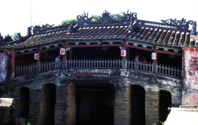 Obwohl ich mich lieber ins Bett legen würde, schließen wir uns natürlich dem Reiseleiter beim Stadtrundgang an. Das geschlossene Stadtbild mit den niedrigen Häusern aus dem 19. Jhdt. wäre eigentlich schon sehenswert. Allerdings befindet sich inzwischen in nahezu jedem Haus ein Souvenir-, Kleider oder sonst ein Krims Krams Laden. Die gesamte Stadt wirkt letztlich wie ein großer Souvenirstand. Natürlich gibt es auch noch eine Menge schöner Ecken. Wir beginnen die Besichtigung bei der gedeckten japanischen Brücke, die einst das japanische mit chinesischen Viertel verbunden hat.