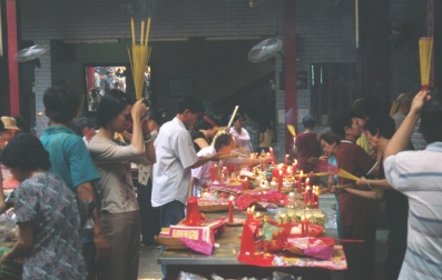Erster Besichtigungspunkt ist der Chua Thien Hau, eine zu Beginn des 19. Jh. von chinesischen Einwanderern aus Kanton errichtete Pagode. Wir betreten die Pagode durch einen Seiteneingang und sind so überrascht, als wir plötzlich inmitten einer wuselnden Menschenmenge stehen. Tatsächlich findet heute hier ein Fest statt und so sind zahllose Chinesen (oder Vietnamesen chinesischer Abstammung) damit beschäftigt, ganze Bündel Räucherstäbchen abzubrennen. Die wenigsten finden dabei die Zeit, längere Zeit vor einem der Götterbilder oder Altäre zu verweilen. Meist hetzen die Menschen von Standort zu Standort, nur um dort jeweils ein paar Sekunden lang hektisch die Räucherstäbchenbündel auf und ab zu schwenken. Andere sind nur hergekommen, um die Räucherstäbchen anzuzünden oder Opfergaben zu präsentieren. Diese werden dann mit dem Moped auf dem schnellsten Wege nach Hause gebracht.