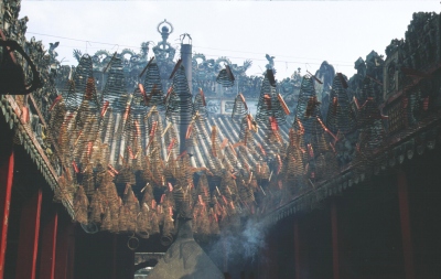 Zwischen den Gläubigen räumen Helfer teilweise abgebrannte Räucherstäbchen, aber insbesondere deren Verpackungen weg. Über dem ersten Innenhof hängen außerdem spiralförmige Räucherstäbchen, die einmal angezündet bis zu zehn Tage brennen können. Mit ihnen sollen Wünsche in Erfüllung gehen. In allen Teilen der Pagode hängen dichte Rauchschwaden, durch die die Menschen zum Teil nur noch undeutlich zu erkennen sind, insbesondere wenn dann noch die Sonne von oben einfällt.
