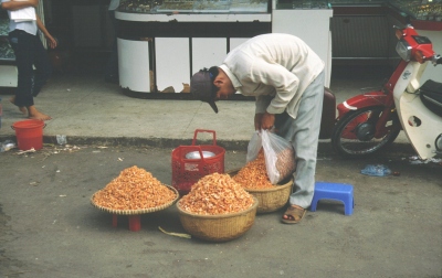 Nächster Halt ist dann der Cho Binh Tay Markt, den wir alle allerdings etwas lustlos anschauen. Zu viele Märkte hat jeder in der Gruppe bereits gesehen. Nun zunächst handelt es sich hier um eine zweistöckige Markthalle um einen Innenhof. Die Rolltreppen in das Obergeschoss funktionieren wohl schon lange nicht mehr. Der erste Stock ist so angefüllt mit Kleiderständen, dass dazwischen kaum Platz zum Durchgehen bleibt (also ähnlich wie in einer typischen westlichen Modeboutique). Da diese Art von Kleidung sowieso keinen in der Gruppe interessiert, suchen wir im Erdgeschoss nach sehenswertem. Dort finden wir dann zahlreiche Stände mit Süßigkeiten und verschiedenen Nüssen in einem Bereich. Ein anderer Bereich ist den Garküchen vorbehalten, gegenüber werden in vielen kleinen Geschäften Räucherstäbchen verkauft. Und in einem anderen Bereich schließlich kann man aus verschiedensten Reissorten auswählen.