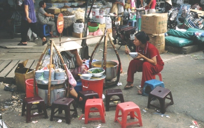 Das erste Mal hat man den Eindruck, in einer richtige Großstadt zu sein. Allerdings einer, die von verschiedenen Herren und damit Stilrichtungen geprägt ist. Im Zentrum dominieren einerseits die französischen Kolonialbauten wie die Oper, das ehemalige Hotel de Ville und eine ganze Reihe von Hotels aus der Kolonialzeit (auch das Grand Hotel, in dem wir untergebracht sind, stammt aus dieser Zeit). In anderen Bezirken der Stadt fallen alte, ziemlich heruntergekommene Betonbauten aus. Das sind die Wohn- und Verwaltungsbauten, die die Amerikaner hinterlassen haben. Der Großteil der Bebauung besteht natürlich aus den typischen asiatischen Stadthäusern. Schmale, mehrere Stockwerke hohe Häuser. Stets mit einem Geschäft oder einer Werkstätte im Erdgeschoss, darüber ein oder mehrere Wohnetagen.