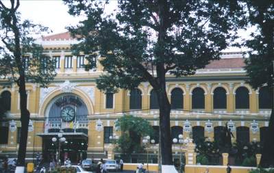 Da das Innere nicht viel her gibt und außerdem gerade Messe ist, mache ich ein paar Bilder von außen und gehe dann hinüber zur Hauptpost, einem Jugendstilbau von 1891. Das Innere sieht mit seiner hohen Decke, den Schaltern an beiden Seiten und den Deckenventilatoren eher wie ein Bahnhof aus. Zumindest ist das hier kein Vergleich zu den deutschen Postshops und Postfilialen. Auch passt das riesige Portrait Ho Chi Minh’s an der Stirnseite der Halle nicht so ganz zum Ambiente.