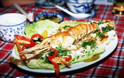 Die Suppe wird in einer Kokosnuss serviert, was ja noch einigermaßen konventionell ist. Aber der anschließende Ananassalat kommt nicht einfach nur in einer halbierten Ananas daher. Nein, aus der halbierten Ananas, den Blättern, Ananasstücken, Chilis und einigem mehr hat der Kochkünstler einen Vogel gezaubert. Nicht nur, dass das Essen jeweils angerichtet ist, wie ein Kunstwerk, es schmeckt auch noch hervorragend. Unsere beiden Nürnberger haben noch mit den Nachwehen ihrer Magenverstimmung zu kämpfen und Johanna hat auch nicht so besonders viel Hunger. So bleibt schließlich der gefüllte Fisch für mich alleine.