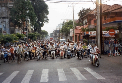 Der Verkehr wird einigermaßen durch Einbahnstraßen und Ampeln unter Kontrolle gehalten. Zwar gibt es hier deutlich mehr Autos als in Nord- und Zentralvietnam. Aber der Verkehr wird immer noch dominiert von unzähligen Mopeds. Dies wird insbesondere bei der beginnenden Rush-hour am morgigen Montag klar, wenn an manchen Kreuzungen die Seitenstraßen hundert und mehr Meter voll sind mit Mopeds.