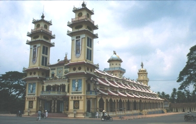 Einige Zeit noch müssen wir uns auf einer immer schlechter werdenden Straße mit immer tieferen Schlaglöchern quälen, bis wir schließlich Tay Ninh erreichen, dem Zentrum der Cao Dai Sekte und Standort ihres größten Tempels. Das riesige Gebäude sieht aus wie eine Mischung aus barocker christlicher Kirche und chinesischem Tempel.