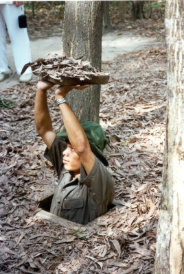 Heute morgen geht es bereits um 7:00 Uhr los. Unser erstes Ziel ist die Gegend von Cu Chi. Während des Vietnamkrieges standen die Vietcong vor dem Problem, Material und Menschen von dem nahe der kambodschanischen Grenze verlaufenden Ho Chi Minh Pfad nach Saigon schaffen zu müssen. Normal über Land war das nicht möglich. Auch waren die Dörfer in der Nähe Saigons ständiges Kampfgebiet. Die Menschen in dieser Gegend gingen daher unter die Erde. Mit einfachsten Werkzeugen wurde ein Tunnelsystem auf mehreren Ebenen angelegt. Die Tunnel verbanden auch die unterirdisch angelegten Wohnräume, Küchen, Kommandoräume und Krankenstationen. Bis in eine Tiefe von 10 m reichte das Tunnelsystem, zum Teil direkt unter den Militärbasen der Amerikaner. Die Tunnel waren in der Regel nur 60 cm breit und 80 cm hoch.
