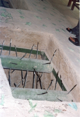 Zuvor wurden noch weitere einfache Fallensysteme vorgeführt, alle mit dem Grundprinzip dem Gegner Spitze Dorne mit Widerhaken in die Beine oder den Unterleib zu stoßen und zwar so, dass eine Gegenbewegung noch schwerere Verletzungen nach sich zogen. Die entsetzten Kommentare der Gruppe wies unsere Reiseleiterin mit dem Hinweis auf Napalm and Agent Orange zurück.