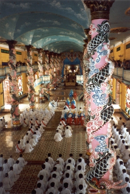 Bei genauerem Hinsehen wird man sicher auch noch Stilelemente aus buddhistischer, konfuzianischer und daoistischer Architektur finden. Der gelb gestrichene Tempel hat tatsächlich etwa die Grundform einer christlichen Kirche. Aber etwa der mehreckige Aufbau statt der Vierungskuppel und andere Elemente machen den Unterschied deutlich. Nach dem wir uns unserer Schuhe entledigt haben, dürfen wir über einen Seiteneingang ins Innere und dort hinauf auf die Galerien entlang des Langhauses. Dabei kommen wir am Platz des Orchesters und der Sänger vorbei, die in etwa da positioniert sind, wo man sonst eine Orgel stehen hat. Der Innenraum erschlägt einem geradezu. Auch hier dominiert gelb an den Wänden. Getragen wird das Langhaus jedoch von Rundsäulen in einem rosa Grundton, um die sich über die gesamte Länge Drachen winden. Der Altarbereich ist von unserem Standort nicht genau zu erkennen. Zum einen stehen die Säulen im Weg, zum anderen verhindern Helfer der Cao Dai, dass die Besucher zu weit nach vorne auf der Galerie gehen und schließlich handelt es sich bei dem Altarbereich eher um ein in chinesischen Tempeln übliches Konglomerat von allem Möglichen.