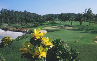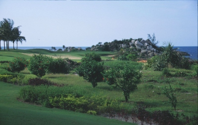 Am ersten Abschlag des Jack Nicklaus-Platzes angekommen, stellt sich heraus, dass dort bereits einige Flights warten. Wir überspringen also die ersten beiden Bahnen und starten auf der Drei. Es dauert eine Weile bis ich bemerke, warum ich ständig über den Ball schlage: die Schlägerschäfte sind auf asiatische Körpergrößen ausgelegt. Ich muss also tiefer in die Knie und dort auch bleiben. Zweite Schwierigkeit des Kurses ist das Rough. Das sieht zunächst einmal nach einem normalen Dicken Grasteppich aus. Ein Schlag macht aber deutlich, dass es nicht einfach Grashalme sind, sondern eher Moos- oder Flechtenartige Strukturen. Man hat nach dem ersten Kontakt mit dem Schlägerkopf gleich ein Büschel aus 15cm langen Pflanzenfasern am Kopf hängen. Das macht es sehr schwierig, aus dem Rough irgendwie etwas Länge zu bekommen. Dritte Schwierigkeit schließlich ist die Hitze. Bereits nach zwei Bahnen läuft der Schweiß in Strömen und nach einigen Bahnen kämpfe ich hauptsächlich gegen die eigene Konzentration und den eigenen Kreislauf. Der Platz selbst verläuft zwischen den Hügeln im Hinterland des Hotels, ist sehr gut gepflegt und öffnet immer wieder den Blick auf das Meer, weswegen der Kurs ja auch Seaview Course genannt wird. Die Bahnen als solche sind nicht eigentlich schwierig, aber optisch sehr schön in die Landschaft eingefügt.