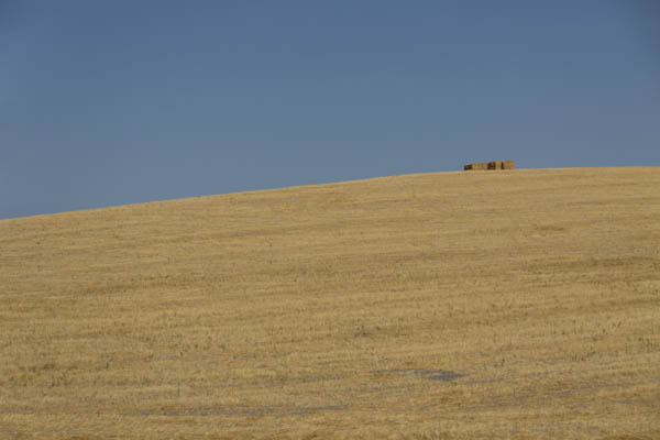 Dann ging es hinunter in die Ebene und Wälder und Gebirgslandschaft wurden ersetzt durch eine flache Hügellandschaft, die landwirtschaftlich genutzt wurde, allerdings bereits abgeerntet war. Die Felder waren gelb-bräunlich mit einigen Strohballen, manchmal einzelnen weißen Feldhäusern, manchmal mit einzelnen Bäumen. Mal sehen, was aus den Aufnahmen, die ich aus dem Bus heraus machte, geworden ist.