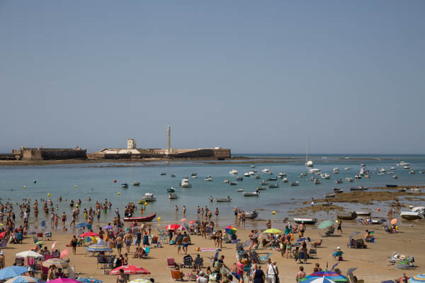 Den Bus verließen wir direkt am Stadtstrand, wo wir uns unter dem Riesen-Ficus Schatten fanden. Rechts von uns war das Castillo de Santa Catalina zu sehen und über einen Damm mit der Stadt verbunden das vorgelagerte Castillo de San Sebastian. Es war Ebbe und die meisten Leute schienen nur ihre Füße in dem niedrigen Wasser zu kühlen.