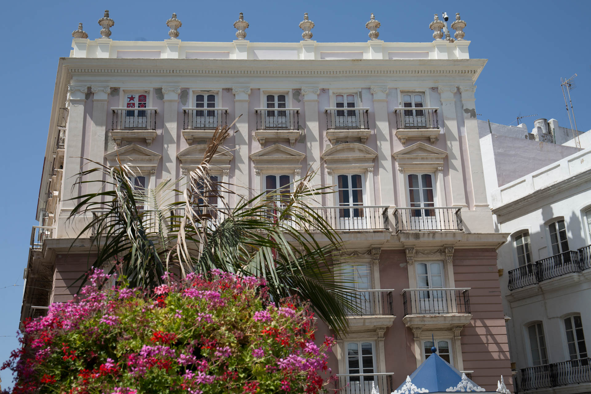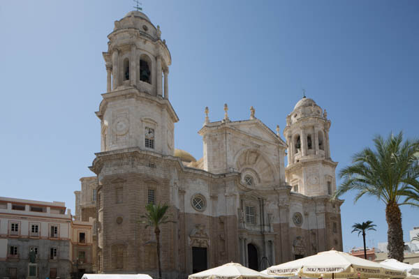 Der Bus sammelte uns am Ende des Parks wieder ein. Wir versuchten einen Fotostopp an der Plaza España mit dem Monumento al la Constitución de 1812. Unser Bus hielt mehr oder weniger mitten auf der Straße und wir stiegen aus. Aber noch während wir die Straße überquerten kam hinter uns ein Stadtrundfahrt-Bus. Also alle wieder rein. Nebenbei beobachteten wir, wie ein PKW in eine Parklücke eingewiesen wurde. Nachdem er drin war, mussten wohl alle Beteiligten feststellen, dass bei einem Abstand von etwa 5 cm zu den Nachbarautos an ein Aus- oder Einsteigen nicht mehr zu denken war. Unser Bus drehte eine Runde um den Platz und hielt an derselben Stelle. Der PKW versuchte immer noch, mit der Parklücke klarzukommen. Nach einigen schnellen Fotos ging es auch schon weiter, nur um kurze Zeit später an der Plaza de San Juan de Dios wieder auszusteigen. Über den recht modernen Platz, dessen Schmalseite die Iglesia de San Juan de Dios und das Rathaus einnehmen, erreichten wir den Platz vor der Kathedrale. Von dort aus führte uns unsere Reiseleiterin noch ein Stück weiter bis zur Plaza de las Flores. Dort trennte sich die Gruppe. Wir gingen wieder zurück zum Platz vor der Kathedrale und fanden einen Tisch in einem der Restaurants am Platz. Johanna entschied sich nach langem Suchen für ein Gericht, dass sich als dünne Wurstscheiben lauwarm mit etwas Öl und Pommes herausstellte. Aber die Wurst schmeckte echt sehr gut. Ich nahm frittierte Fische, deren Name mir überhaupt nichts sagte. Die Fische waren so etwa 12-15 cm lang. Das Fleisch ließ sich ganz leicht von der Mittelgräte lösen und war sehr schmackhaft. Nach dem Essen schlenderten wir über den kleinen Markt vor der Kathedrale. Dabei entdeckte ich, dass man, entgegen den bisherigen Vermutungen, doch auf den einen Turm der Kathedrale konnte. Ich löste ein Ticket und machte mich auf den Weg nach oben. Ungewohnt, aber in Andalusien anscheinend üblich, führte keine Treppe, sondern eine Rampe um den Kern des Turms nach oben. Damit fand ich es weniger anstrengend, die 40 Höhenmeter zu überwinden. Von oben hatte man natürlich eine tolle Aussicht auf Cádiz.