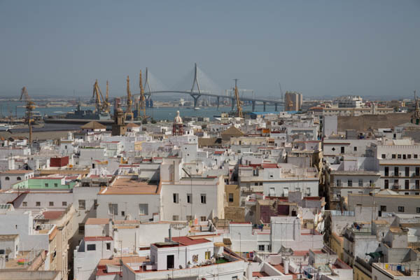 Cádiz erreichten wir über die ältere Puente José León de Carranza mit Blick auf die neue Brücke. Beim Fahren durch die Stadt konnten wir viele Leute beobachten, die mit ihrem Strand-Trolley unterwegs waren zum oder vom Strand. Die Stadt lag unter strahlender Sonne. Obwohl es Mittag war, war die Luft glasklar.