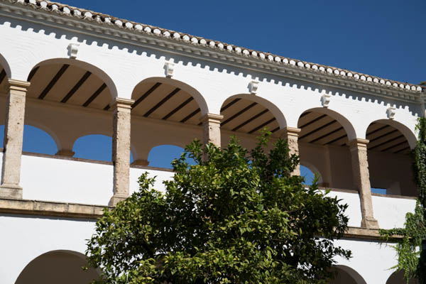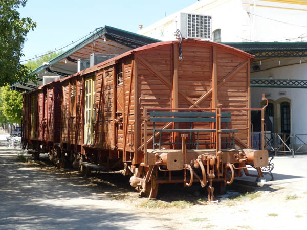 Mittags machten wir bei dem kleinen Dorf Luque Halt. Zu unserer Überraschung handelte es sich bei dem Restaurant um den ehemaligen Bahnhof, wo wir schattige Plätze unter dem streckenseitigen weit vom Gebäude wegkragenden Bahnhofsdach fanden. Den Platz hatte unsere Reiseleiterin wohl vor ein paar Jahren entdeckt. Inzwischen war es kein absoluter Geheimtipp mehr, zwei weitere Busse hielten kurz nach uns. Im eigentlichen Bahnhofsgebäude befanden sich neben dem Restaurantbetrieb natürlich auch ein kleiner Laden, der, ebenfalls natürlich, zahlreiche Olivenprodukte verkaufte. Wir sammelten später Mandeln, Olivenöl (biologisch angebautes und die Eigenmarke des Restaurants), Safran und Johanna noch einen Stofftier-Stier ein.