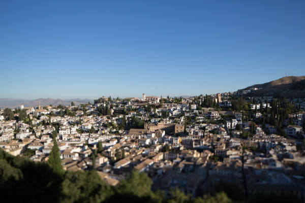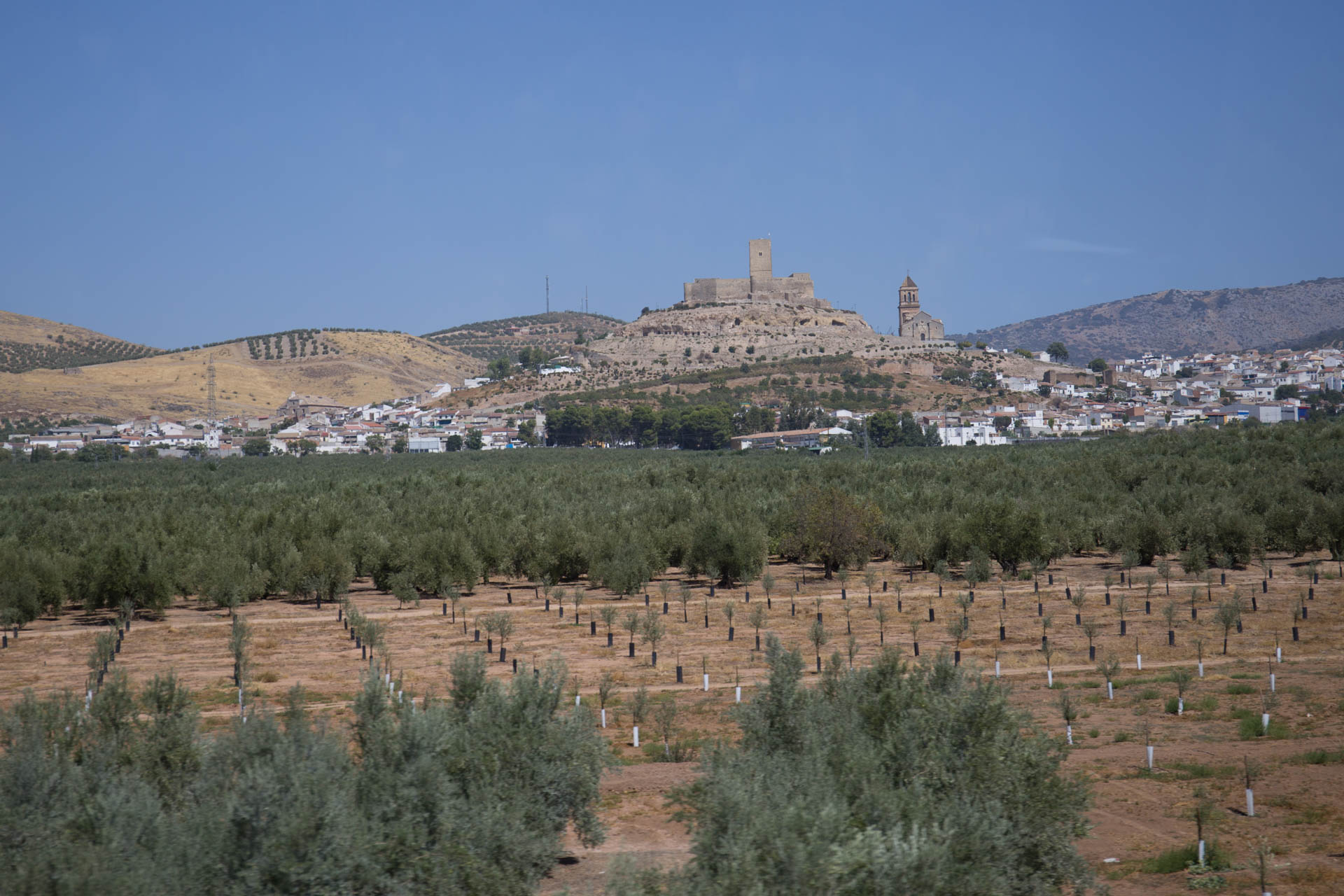Zwischen Córdoba und Grenada fuhren wir durch eine Hügellandschaft, die auch mal zu kleineren Bergen anstieg. Fast die ganze Landschaft war von Olivenbaumplantagen bedeckt, die sich sichtlich auch die steileren Hügel hoch und in die lichten Baumbestände hinein ausdehnten. Das Land hier gehört seit der Reconqusita wenigen Großgrundbesitzern. Auf einigen der Hügel thronten Burgdörfer, die eben aus der Zeit der Rückeroberung stammten. Leider lagen die auf der falschen Busseite oder gegen die Sonne, so dass ich nicht richtig fotografieren konnte.