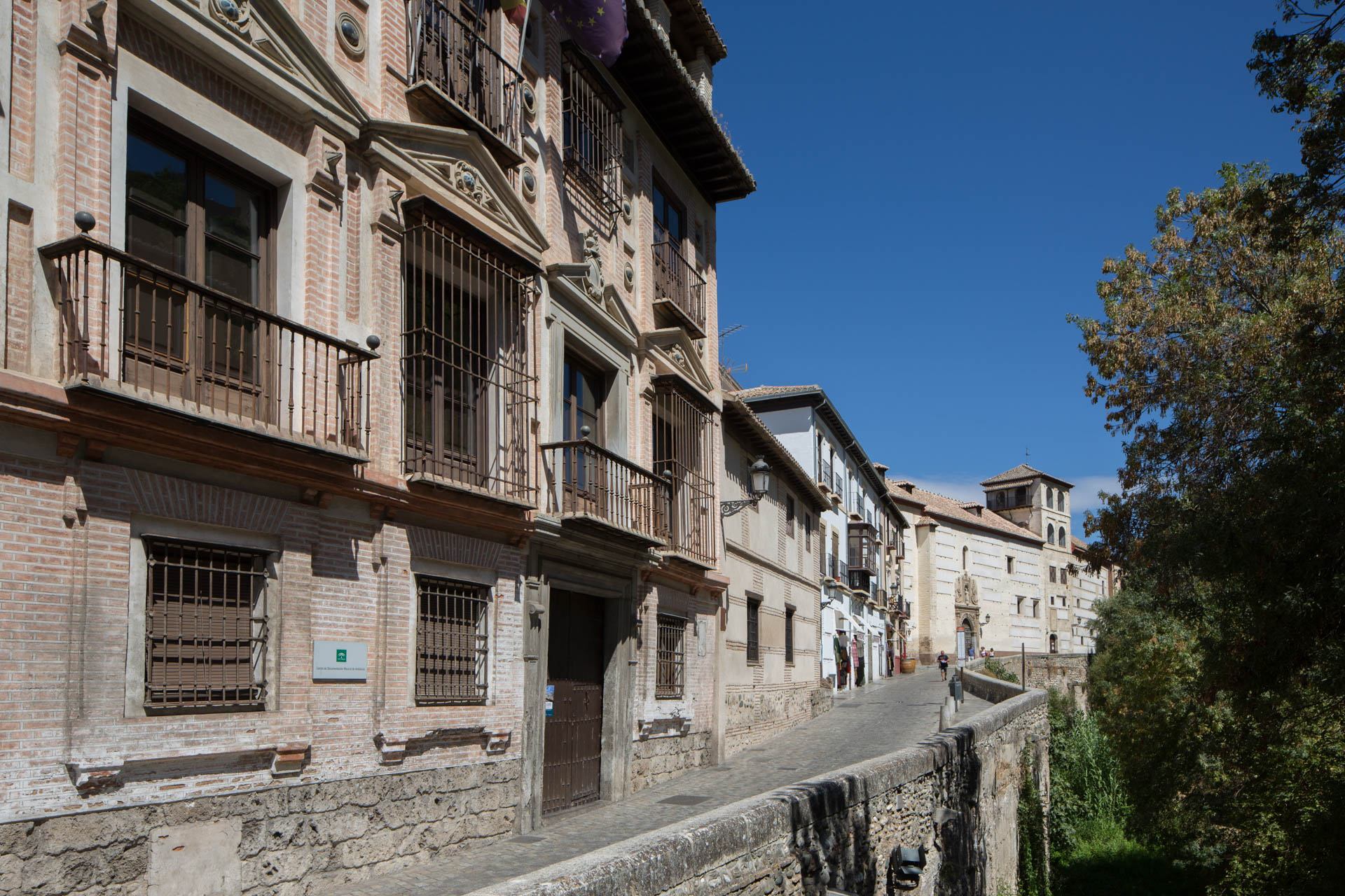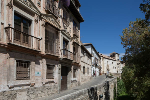 Unser Hotel in Grenada lag mitten im Zentrum an einer schmalen gepflegten Straße, allerdings ohne Haltemöglichkeiten für den Bus. Der musste ein Stück weiter zu einem kleinen Platz mit Bäumen fahren, von wo wir unser Gepäck wieder zurückschleppen musste. Wer bei Studiosus auf die Idee gekommen war, den Gepäckservice abzuschaffen, hat anscheinend nie einen Koffer bei fast 40° durch die Gegend bewegt.