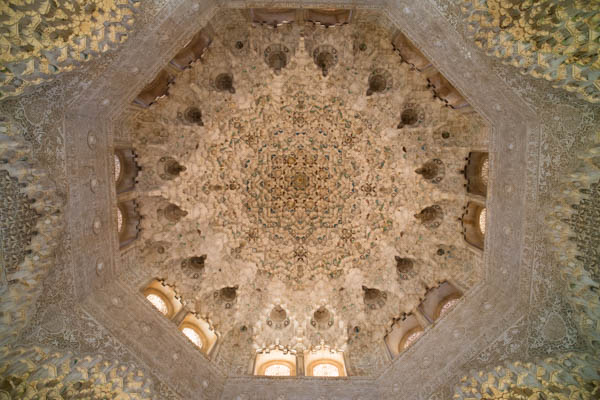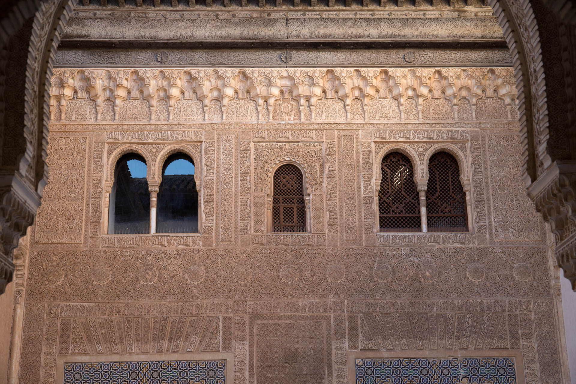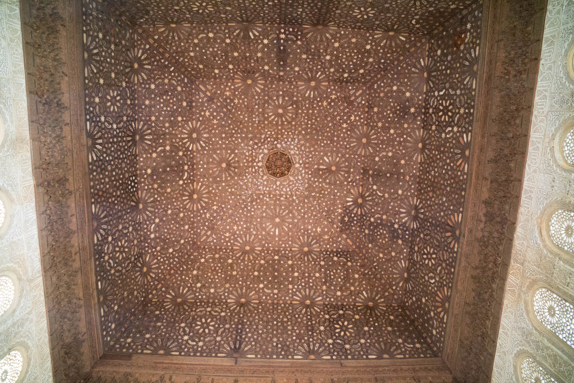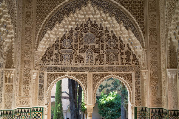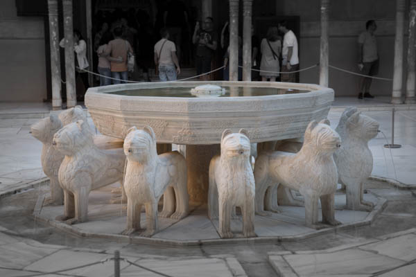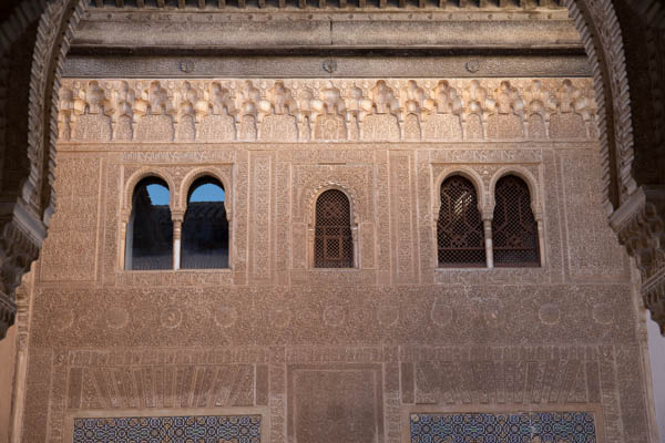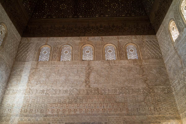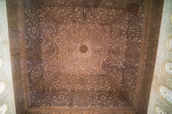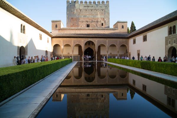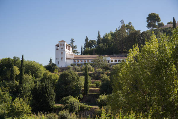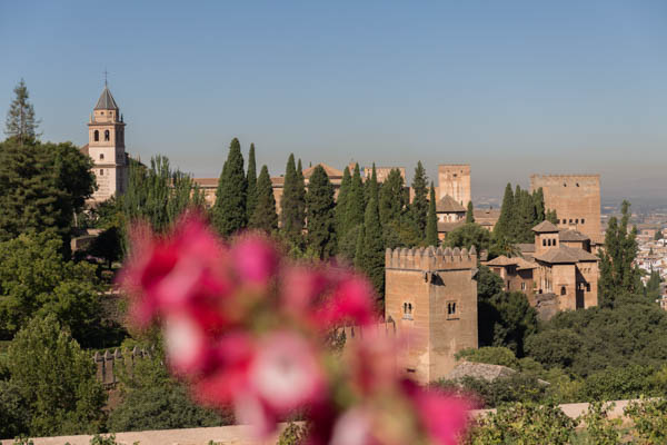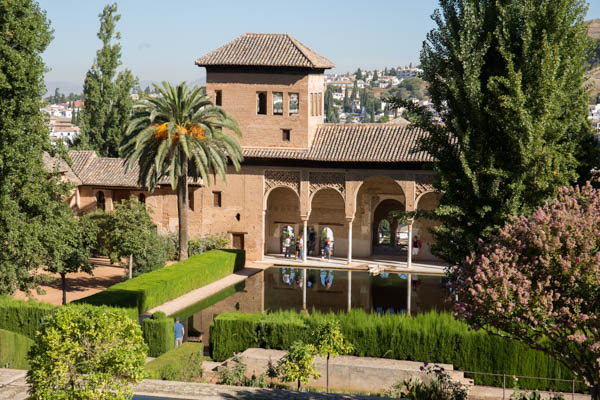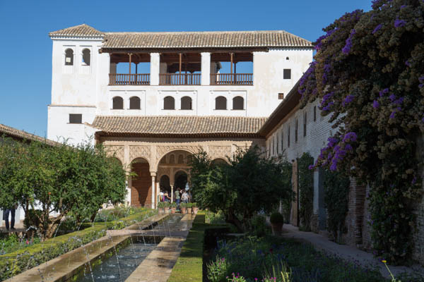 Das Auge wusste in den Räumlichkeiten eigentlich nicht so recht wohin. Die feinen Arbeiten der Wandintarsien, der Stuckverzierungen und der Decken waren in der Kürze der Zeit gar nicht richtig zu erfassen. Immer wieder ergaben sich durch Fenster und Maueröffnungen auch Ausblicke auf das unter uns liegende Stadtviertel und den Hügel gegenüber. Es fiel mir im Nachhinein schwer, mich an das Gesehene wirklich zu erinnern. Die Räume ziehen ihre Attraktivität aus den Wand- und Deckenverzierungen, nicht durch ihre Einrichtung, die einfach nicht mehr da ist. Diese Verzierungen sind zwar unglaublich schön, es fehlt aber dann das Objekt, an dem sich die Erinnerung festmachen kann. Vielleicht ist das ja der Grund, warum der Löwenhof jedem im Gedächtnis bleibt. Der Brunnen stellt quasi den Kristallisationskeim der Erinnerung dar, auch wenn die stilisierten Löwen als solches eher schlicht sind. Jedenfalls vergingen die 1,5 Stunden der Führung durch die Paläste wie im Fluge. Nach einer kurzen Pause setzten wir den Rundgang im Generalife, dem Garten des Architekten fort. Erstaunlich, stand man auf einem offenen Platz, brannte die Sonne schon wieder kräftig herunter. Sobald man aber auf Wegabschnitten unter den Bäumen war, blieb es angenehm kühl. Trotz der fortgeschrittenen Jahreszeit blühten auch noch recht viele Blumen. Auf dem Spaziergang hinüber zur Sommerresidenz Palacio de Generalife konnte der Blick immer wieder über das Tal und die Paläste schweifen. Das Gelände füllte sich zusehends und durch die zugänglichen Bereiche der Sommerresidenz musste man sich fast schon schieben.