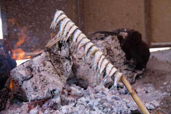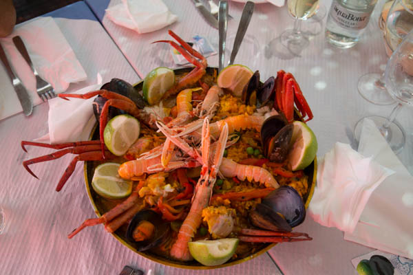 Unser Lokal lag direkt am Strand und schien nicht nur bei Touristen sehr beliebt zu sein. Auf einer Holzveranda unter Sonnenschirmen machten wir es uns an 6er-Tischen gemütlich. Für uns ungewöhnlich fing das Menü mit einer großen Obstplatte an, die mit allerlei bekanntem und weniger bekanntem Obst gefüllt war. Danach wurde eine Meeresfrüchte-Paella serviert. Ich hatte schon lange keine Paella mehr gegessen und war daher umso begeisterter. Da sich unsere Tischnachbarn bei Garnelen und Krabbenbeinen sehr zurückhielten, bekam ich davon umso mehr ab. Besonders bitten muss man mich da ja nicht. Unsere Reiseleiterin hatte die Tage zuvor wegen des Hauptganges herumgefragt. Auch weil sich Johanna gleich gemeldet hatte, dass sie zwar Fisch, aber keinen mit Gräten essen würde, gab es gegrillten Schwertfisch mit Gemüse. Auf den hatte ich mich eigentlich auch sehr gefreut. Leider waren die Scheiben zu dünn und der Fisch damit tot. Schwertfisch ist ja ähnlich hitzeempfindlich wie Thunfisch. Grillen geht eigentlich nur in sehr dicken Scheiben, sonst ist der Fisch durch und trocken. Unsere italienische Mitreisende erzählte mir später, dass sie deswegen mit dem Koch diskutiert hatte. Natürlich kannte sie auch Schwertfisch und wie er sein sollte. Der Koch wollte das aber irgendwie nicht einsehen. Aber mal von dem Fisch abgesehen war das Essen wirklich klasse und das Ambiente am Strand und in dem Lokal richtig schön. Und unser Tisch war wohl einer von zweien mit dem höchsten Weinkonsum…