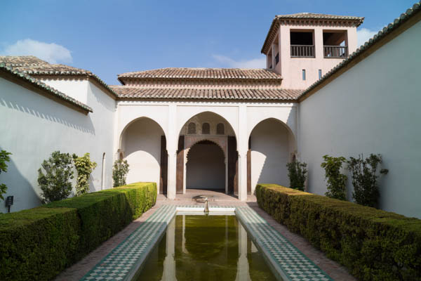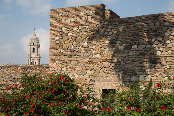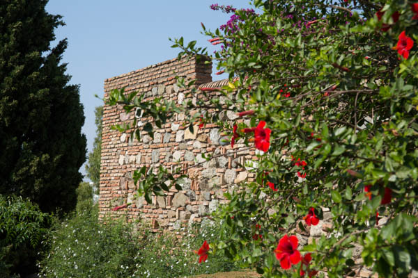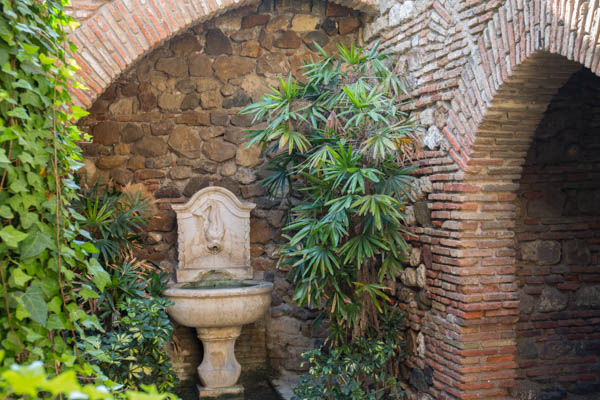 Auf der Höhe des römischen Theaters angekommen wurde klar, dass es wenig Sinn machte, extra um den halben Hügel herum zu laufen, nur um zum Aufzug zu kommen, der auf den Hügel hinaufführt. So hoch war der nun wirklich nicht. Statt Kasse mit Personal gab es zwei Ticketautomaten mit Personal zur Erklärung. Was das für einen Sinn macht, einen Automaten aufzustellen und dann doch jemanden zum Erklären zu brauchen, kann man nur bedingt verstehen. Jedenfalls hatte ich jetzt wieder Kleingeld, weil der Automat auf einen 20 € Schein das Wechselgeld in Münzen ausspuckte. Die Alcazabar ist irgendwie ein Zwischending zwischen Palast und Burg (die eigentliche Burg, das Castillo de Gibralfaro, liegt noch ein ganzes Stück höher auf einem Nachbarhügel. Dafür reichte die Zeit definitiv nicht mehr). Kleine Innenhöfe, kleine Wasserkanäle auf dem Boden und eine durchgängige Ziegelarchitektur machten den Charme der Anlage aus. Ob die Ziegelarchitektur ursprünglich verputzt oder verkleidet war, konnte ich vor Ort nicht feststellen. Jedenfalls gab es ein paar schöne Fotomotive. Pünktlich zum „Point-of-Return“ machte ich mich auf den Rückweg (das hatte ich schon mehrfach praktiziert, den Zeitpunkt für die Rückkehr genau festzulegen). Um 11:40 Uhr war ich tatsächlich wieder im Hotel und musste erst mal duschen und komplett die Kleidung wechseln.