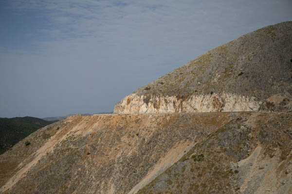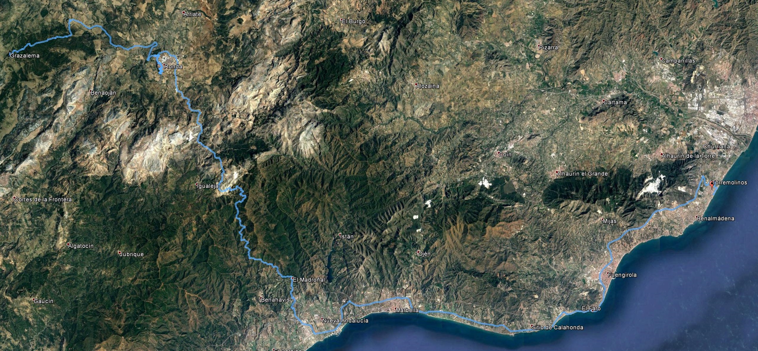 Die Straße zog sich in Serpentinen die Berge hinauf, die noch lange durch niedrigen Kiefernbaumbewuchs ziemlich grün aussahen. Erst weiter oben kam der weiße Kalksteinfels durch. Wir überquerten einen Pass bei etwa 1000 m Höhe, von wo aus es wieder hinunter Richtung Ronda auf 730 m ging.