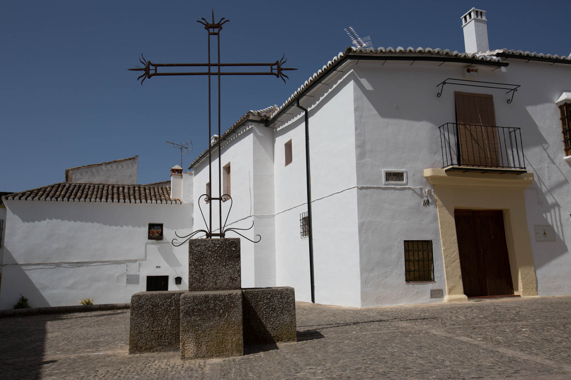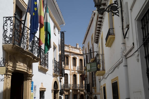 In Richtung Altstadt trafen wir dann auf die Plaza España. Ronda liegt bekanntermaßen auf beiden Seiten einer Schlucht, die der Rio Guadalevín gegraben hatte. Über die 100 m tiefe Schlucht führt prominent die Puente Nuevo. Die Puente Viejo war von hier oben aus auch zu sehen, die dritte Brücke nicht, weil die Schlucht sich aus den Augen windet. Ich hatte vorher im Reiseführer einen Punkt ausgemacht, von dem aus man die neue Brücke vor dem Schluchteingang sehen müsste. Die Seite lag aber noch im Schatten.