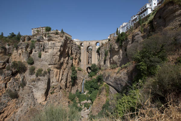 Vor der Weiterfahrt hatten wir genügend Zeit, den Ort auf eigene Faust zu erkunden. Johanna wollte einen Schaufensterbummel machen. Eine der Reiseteilnehmerinnen und ich machten uns auf den Weg zum Aussichtspunkt am Hang der Schlucht mit Blick auf die Puente Nuevo. Der Weg führte von der Plaza de Maria Auxiliadora in langgezogenen Stufen hinunter. Man wäre wohl bis hinunter zum Fuß der Schlucht gekommen, die rutschige Sandpiste zum Aussichtspunkt zweigte aber vorher ab. Ein schmaler Pfad ging auch von weiter bis unter die Brücke. Aber von der Position des alten Stadttores aus hatte man genau den Blickwinkel, den ich gesucht hatte. Von hier aus war auch zu erkennen, dass der kleine Fluss aus der Schlucht unter der Brücke in einen kleinen Wasserfall mündet.