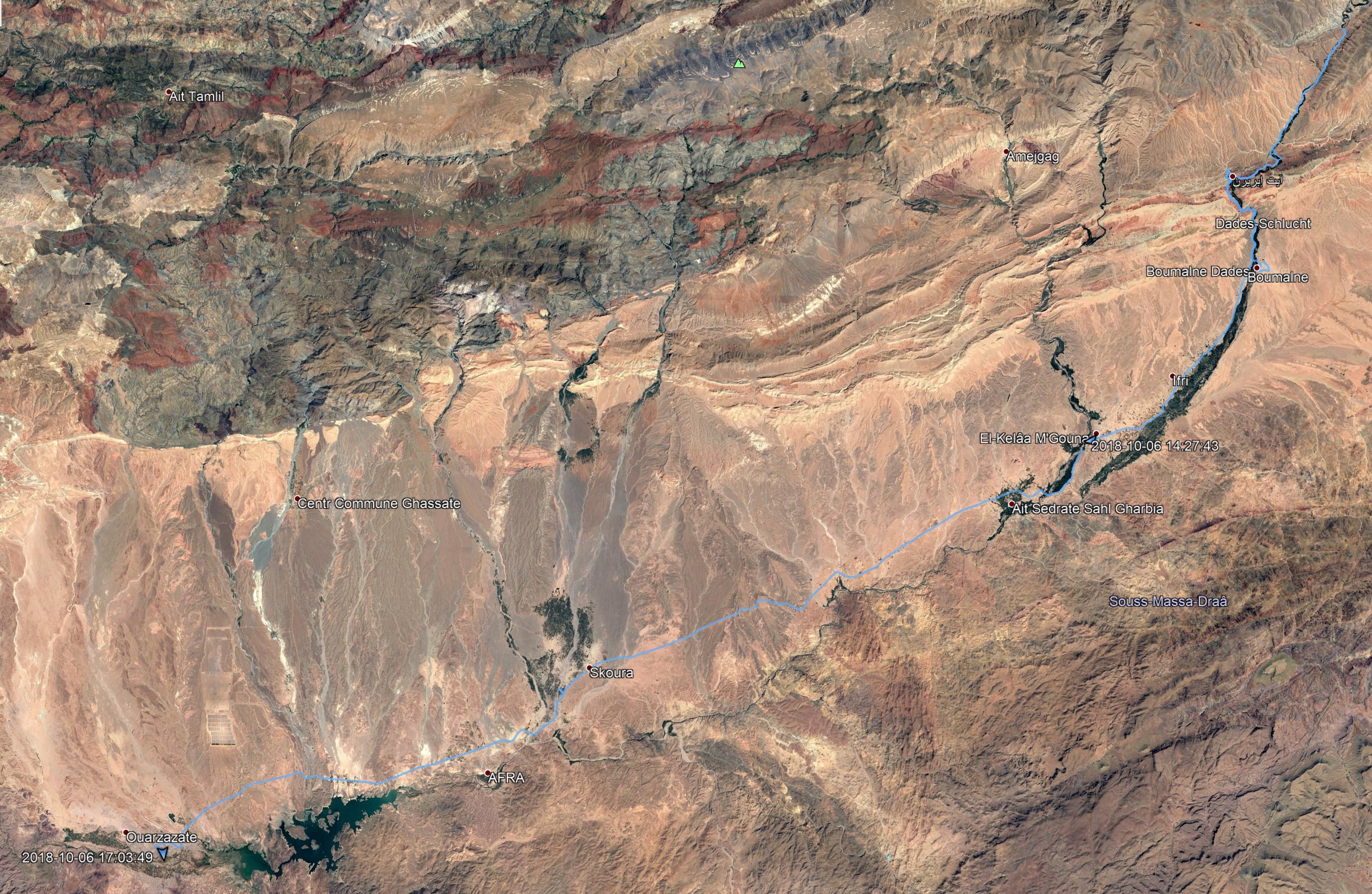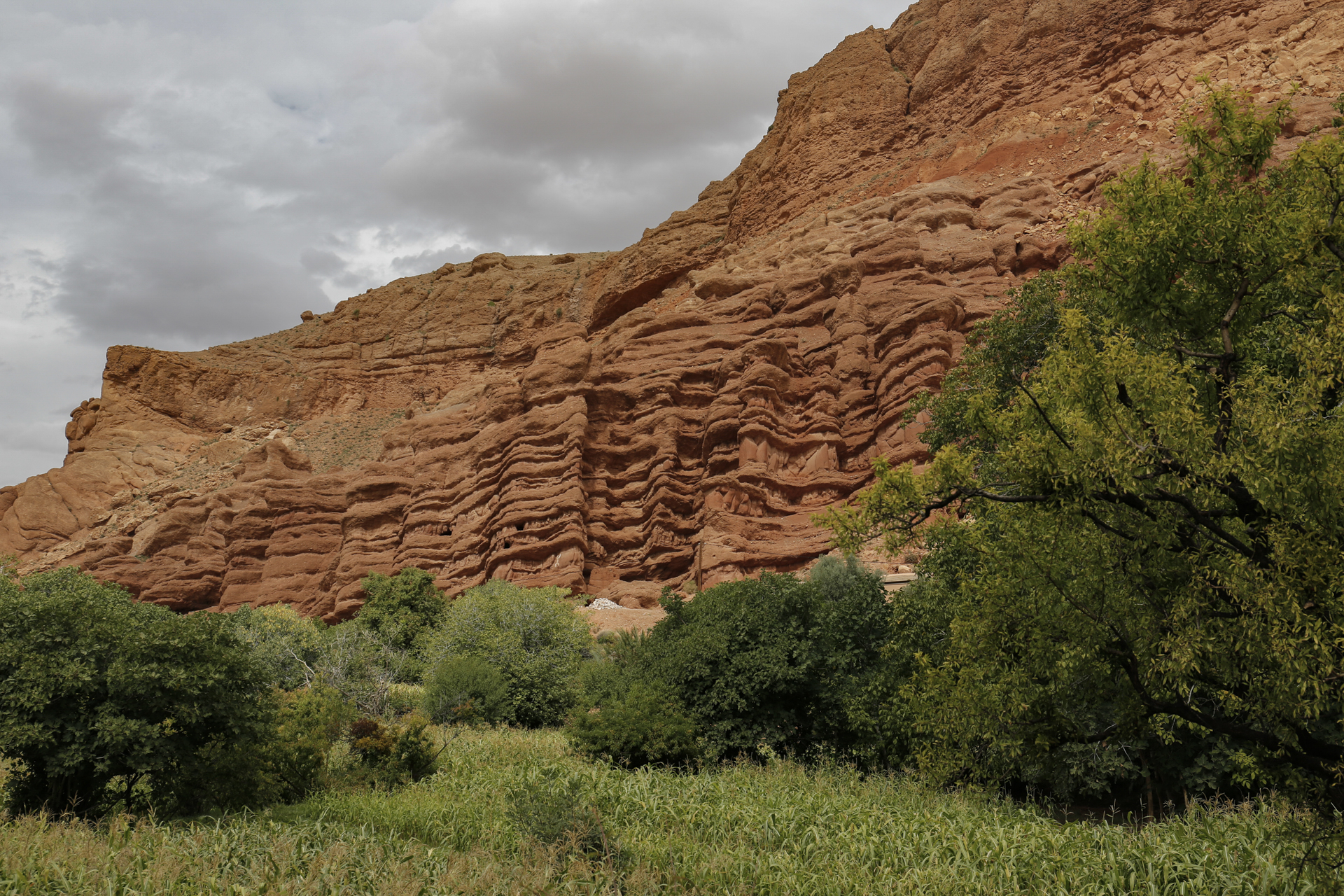 Zwar hatte sich der Fluss tief in die Landschaft eingegraben, war aber viel mächtiger gewesen als die Todhra. Insofern war das Tal recht breit, die heutige Vegetationszone aber nur noch recht schmal. Da wir uns hier auf über 1.500 m Höhe befanden, gab es auch keine Palmen mehr. Diese waren ersetzt durch Silberpappeln.