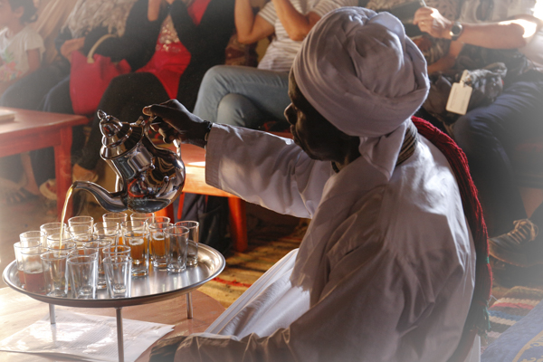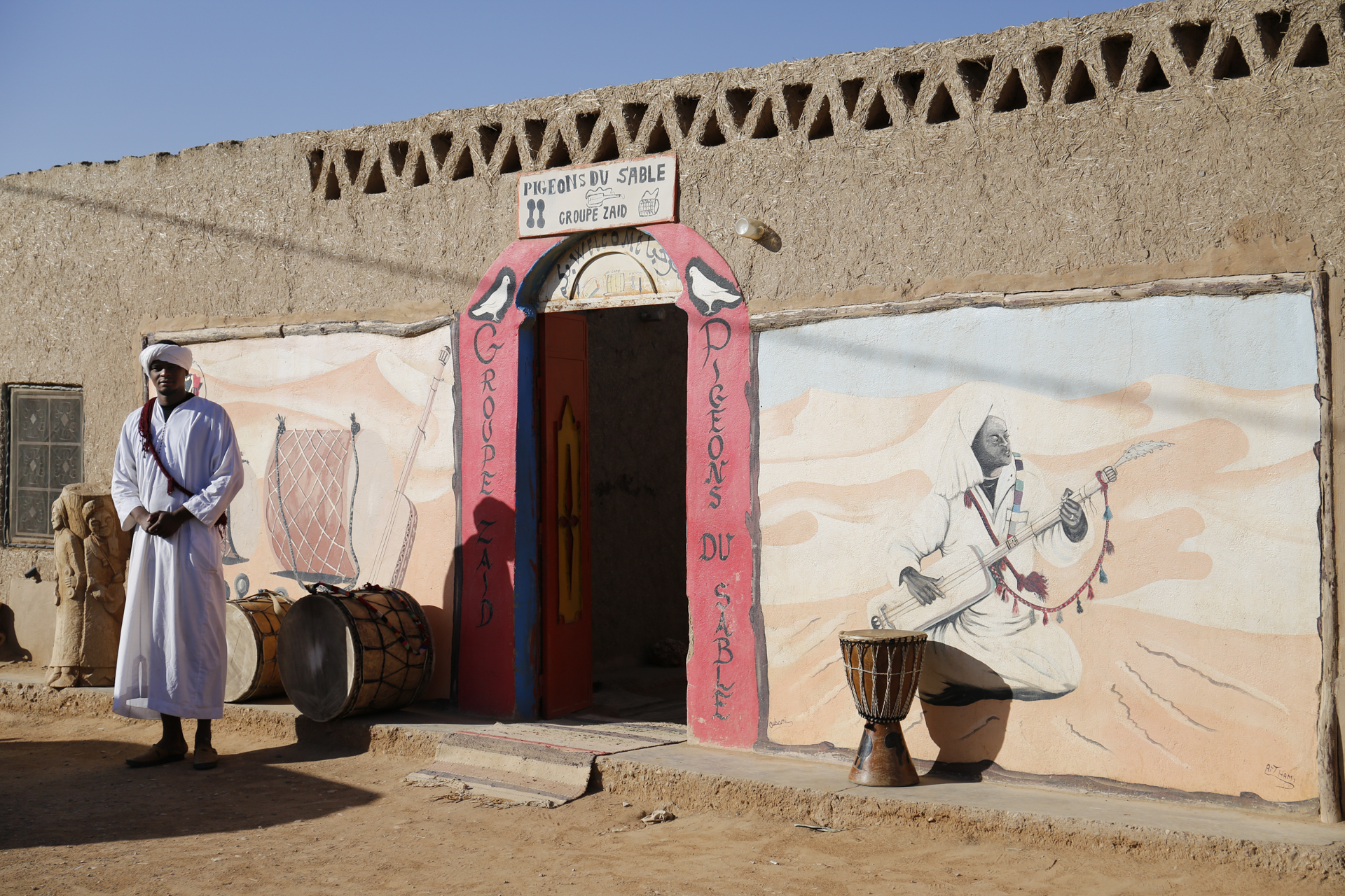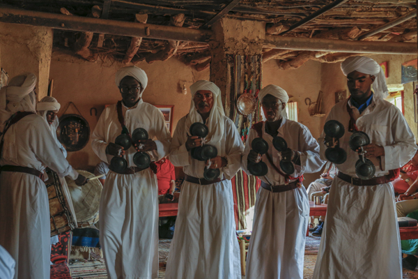 Nach dem Frühstück fuhren wir noch ein Stück nach Süden in das kleine Dorf Khamlia. Dort besuchten wir die Gnaoua-Musiker Les Pigeons du Sable. Auch eine marokkanische Touristen-Familie war schon da. Die Musiker praktizieren eine Art Musik-Therapie, die im Zusammenhang steht mit einem islamischen Exorzismus und der Vertreibung zumindest der unfreundlichen Djinns. Bei den verschiedenen Stücken kamen zwei Sätze an Instrumenten zum Einsatz. Zu Beginn große Trommeln und eine Art Doppelschelle. Im zweiten Teil kam noch ein Saiteninstrument hinzu. Die marokkanischen Frauen tanzten recht bald auch mit. Die Frauen aus unserer Gruppe machten teilweise auf Aufforderung mit. Ich war auf die Idee gekommen, ein Teil der Musik mit meinem Handy mitzuschneiden. Das erwies sich als überflüssig, weil es die Musik auch als CD gab, die ich am Ende erwarb.
