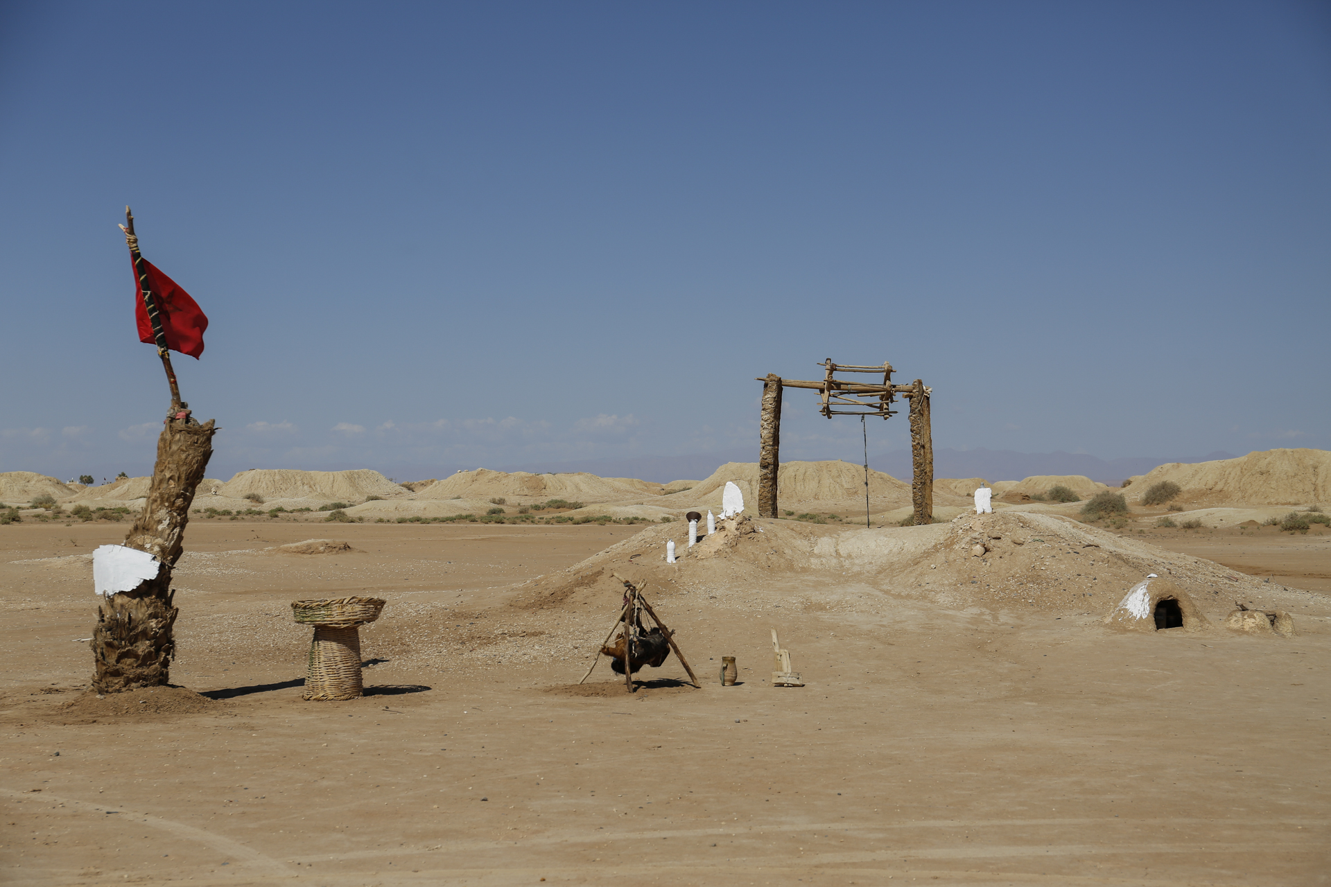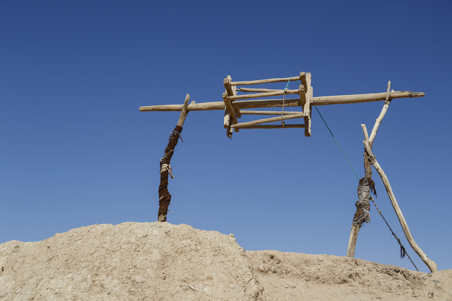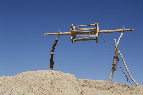 Einen Zwischenstopp gab es in einer Region, in der sich in mehreren parallelen langen Reihen etwa 2 Meter hohe große Maulwurfshügel erhoben. Das Holzgestell darüber ließ an Brunnen denken. Es handelt sich aber tatsächlich um die Abraumschächte der unter der Erde verlaufenden Wasserkanäle, die das Grundwasser aus den höher liegenden Bergen zur Oase brachten. Diese Kanäle sind so groß, dass man darin stehen kann. An der Stelle, an der wir haltmachten, war eine Treppe nach unten gegraben und der Kanal ein Stück mit Kerzen ausgeleuchtet.