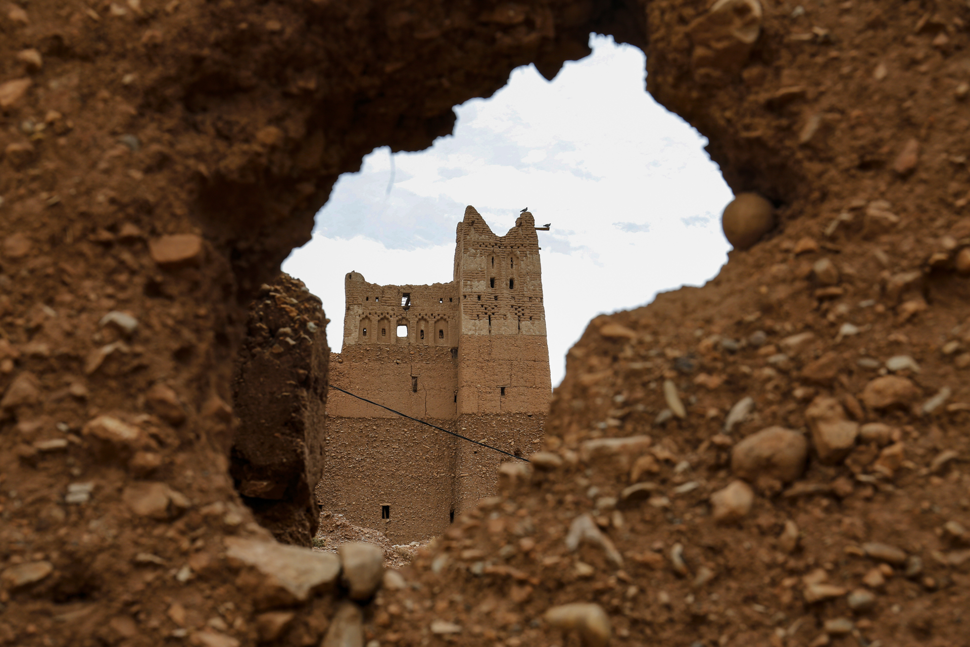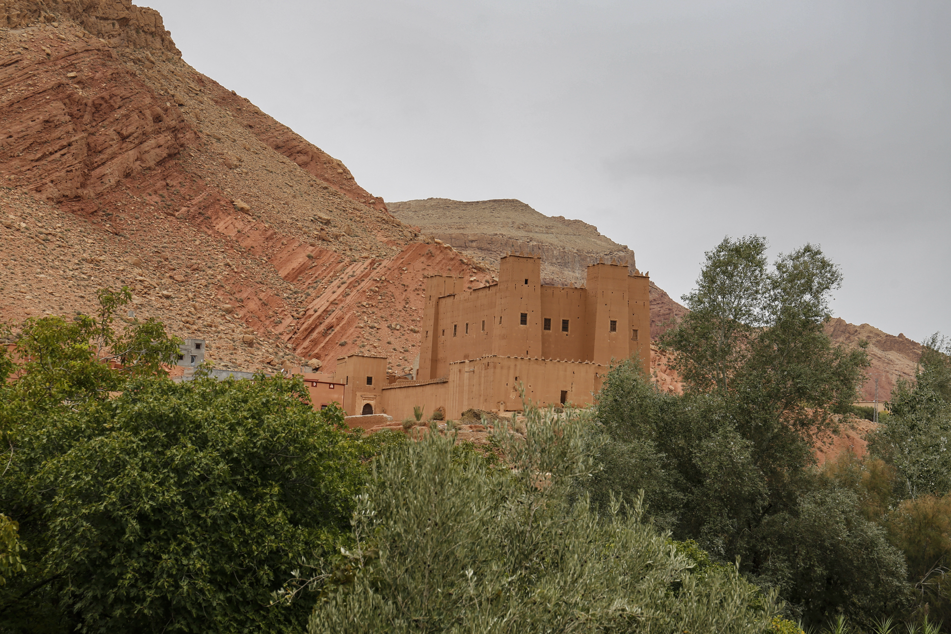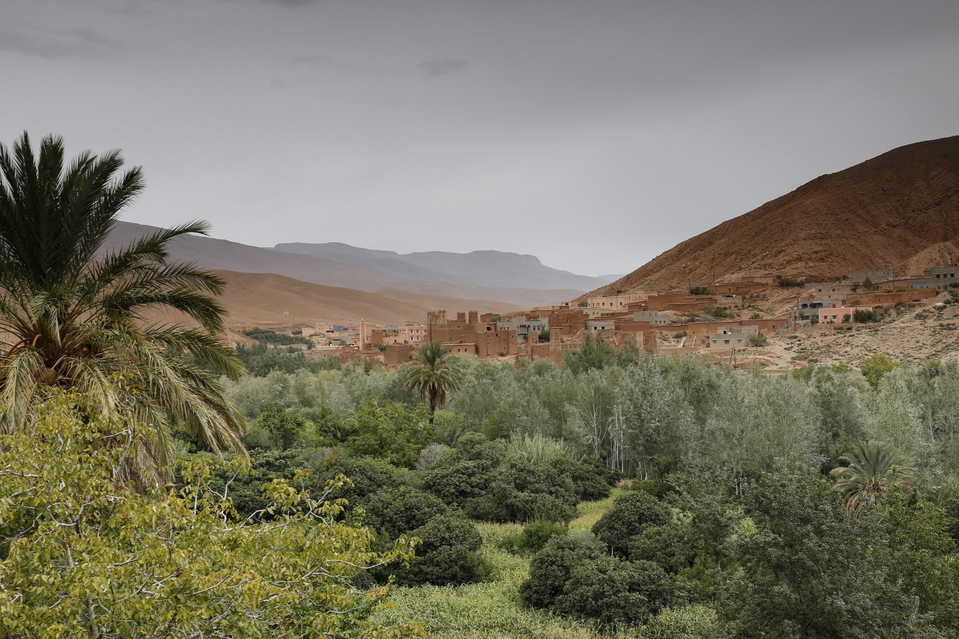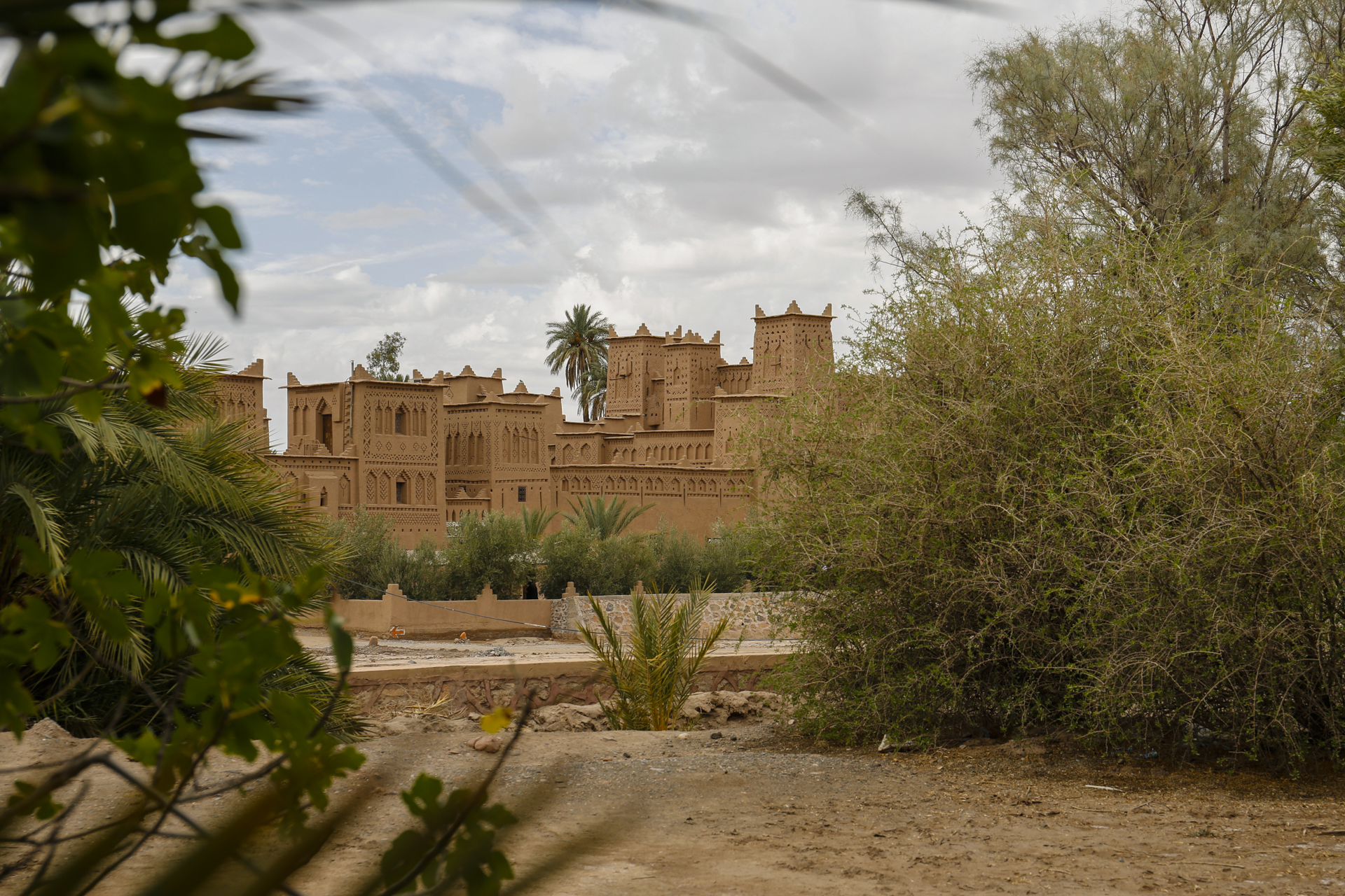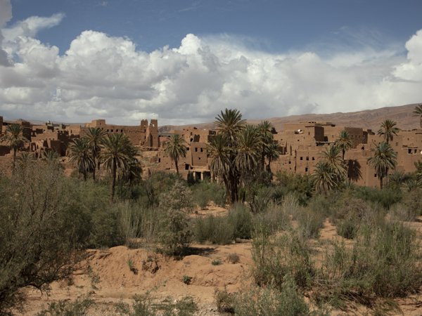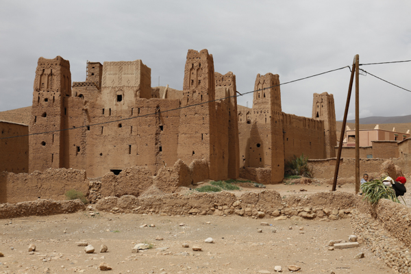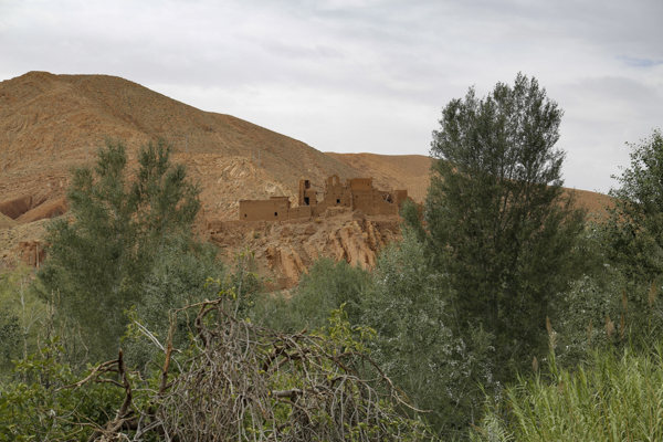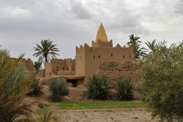 Direkt an der Straße stand aber erst einmal eine schön restaurierte und als Hotel genutzte alte Kasbah. Ein Stück hinein in die Oase stießen wir auf ein aufgelassenes Sufi-Kloster, wo aber das Grabmal des Sufi-Meisters oder Marabu, also der Marabu, erhalten ist und aus den Palmen herausragte. Nach ein paar Minuten erreichten wir das Flussbett. Auf der anderen Seite erhob sich die Kasbah Amerhidil, deren verschiedene Bauabschnitte gut zu erkennen waren. Ganz rechts der alte verlassene Teil. In der Mitte der ebenfalls als Hotel genutzte Hauptteil. Und links dann noch der neue Bauabschnitt, der aber nicht mehr so richtig im Kasbah Stil aus Stampflehm errichtet ist, sondern modern aus Beton.