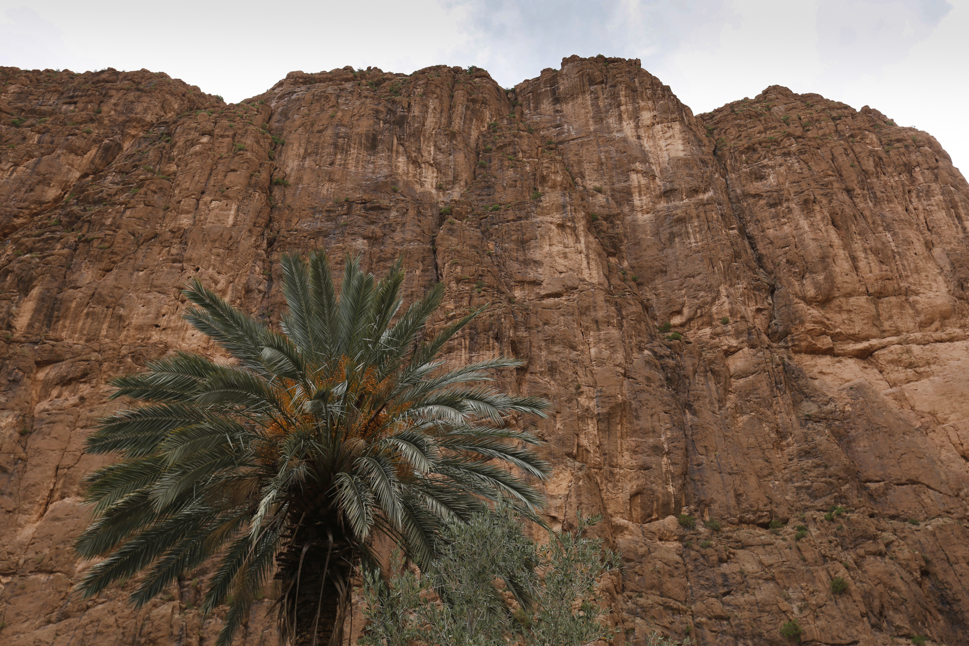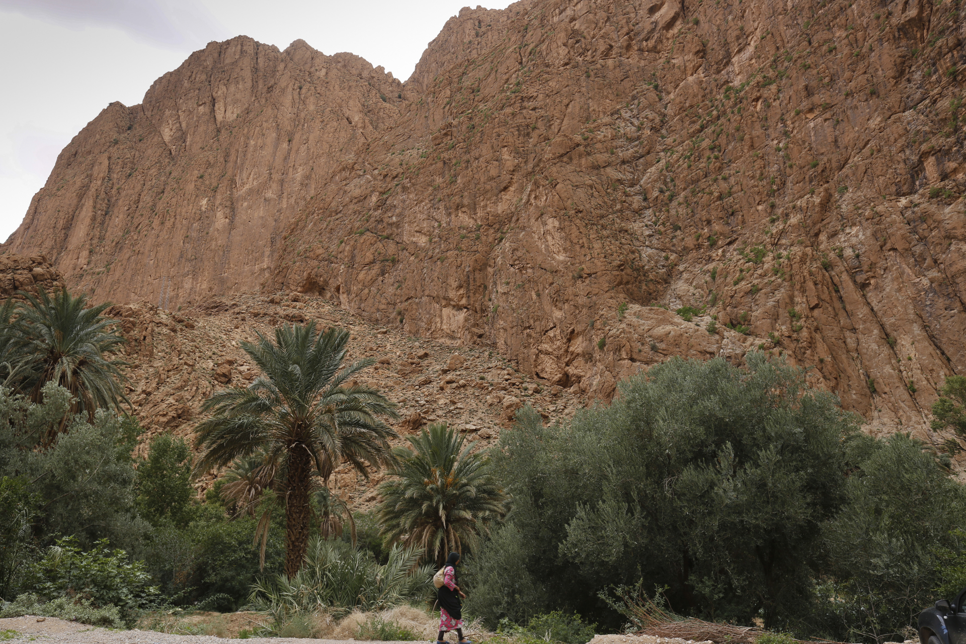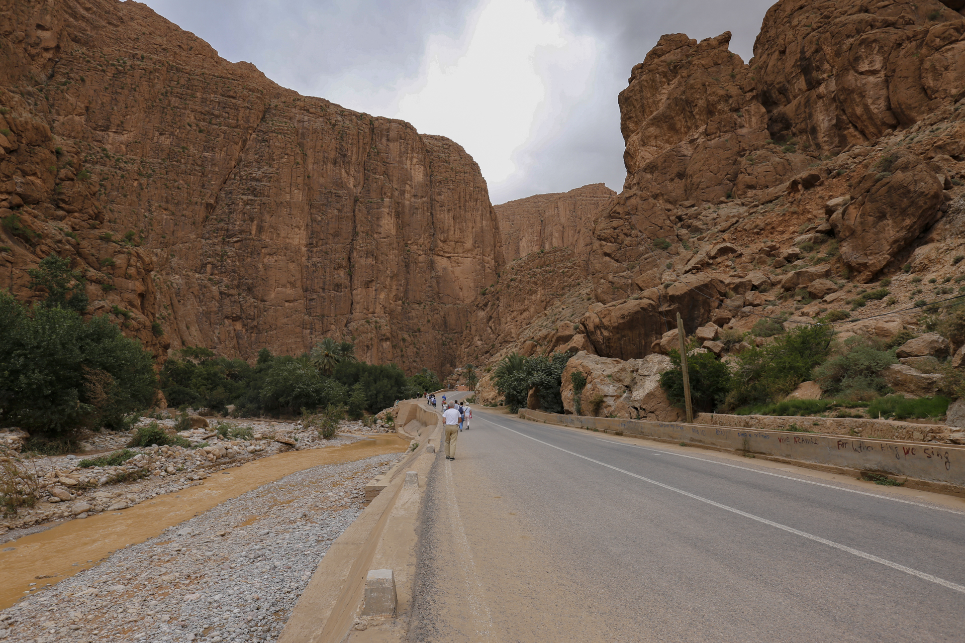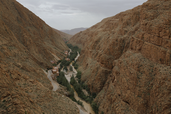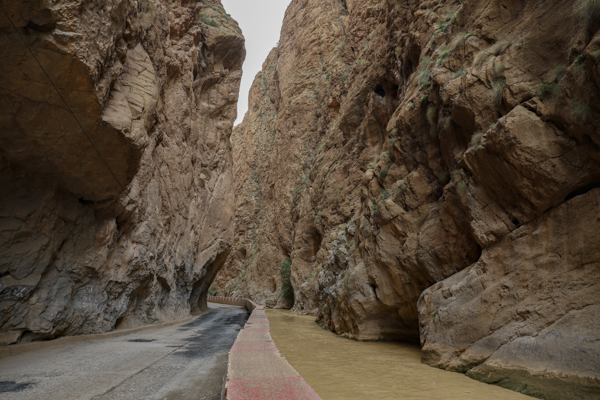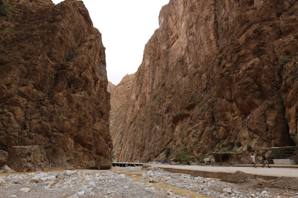 Über einige Fotostopps oberhalb der Todrha-Oase fuhren wir in die gleichnamige Schlucht. Rechts und links, später nur noch einseitig setzte sich die Vegetationszone fort. Daneben die Wohnbebauung und schließlich die immer höher und steiler aufragenden Felsen. Dann hörten auch die Dörfer auf und in der Schlucht fanden neben dem Flüsschen und der Straße nur noch eine schmale Vegetationszone Platz. Dann hörte auch die auf. Inzwischen hatten wir den Bus verlassen, der in der Schlucht vorausfuhr, während sich die Gruppe zu Fuß durch die Schlucht bewegte. Irgendwie war der Großteil recht schnell unterwegs, so dass die paar Fotografen Probleme hatten, Anschluss zu halten. Zweimal begab ich mich ins Flussbett. Das Wasser war eh nicht hoch und so konnte man leicht auf eine der Kiesbänke wechseln, um eine andere Perspektive zu finden, bei der die Straße nicht so dominant war.