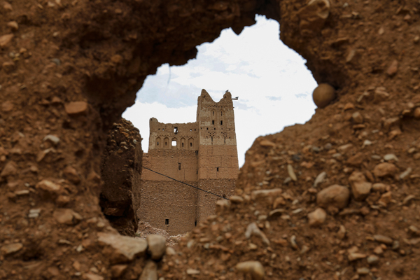 Nach dem Toilettenstopp fuhren wir schon auf der 1.000 m Hochebene zwischen Hohem Atlas und Antiatlas. Und hier wurde auch das Geheimnis um die Löcher in den Mauern gelüftet, das uns schon seit Tagen begleitete. Einer der Mitreisenden hatte wohl das richtige Stichwort "Verschalung" genannt. Stampflehmmauern wurden, ähnlich wie Betonmauern, dadurch erreichtet, dass erst eine Verschalung aus Brettern gebaut wurde. Als senkrecht zur Mauerebene verbindendes Element zwischen den Brettern dienen Balken. Die Verschalung wurde dann mit Stampflehm aufgefüllt. Nach dem Trocknen wurden die Bretter entfernt und die Balken aus der Mauer gezogen. Dadurch blieben eben die Löcher übrig.