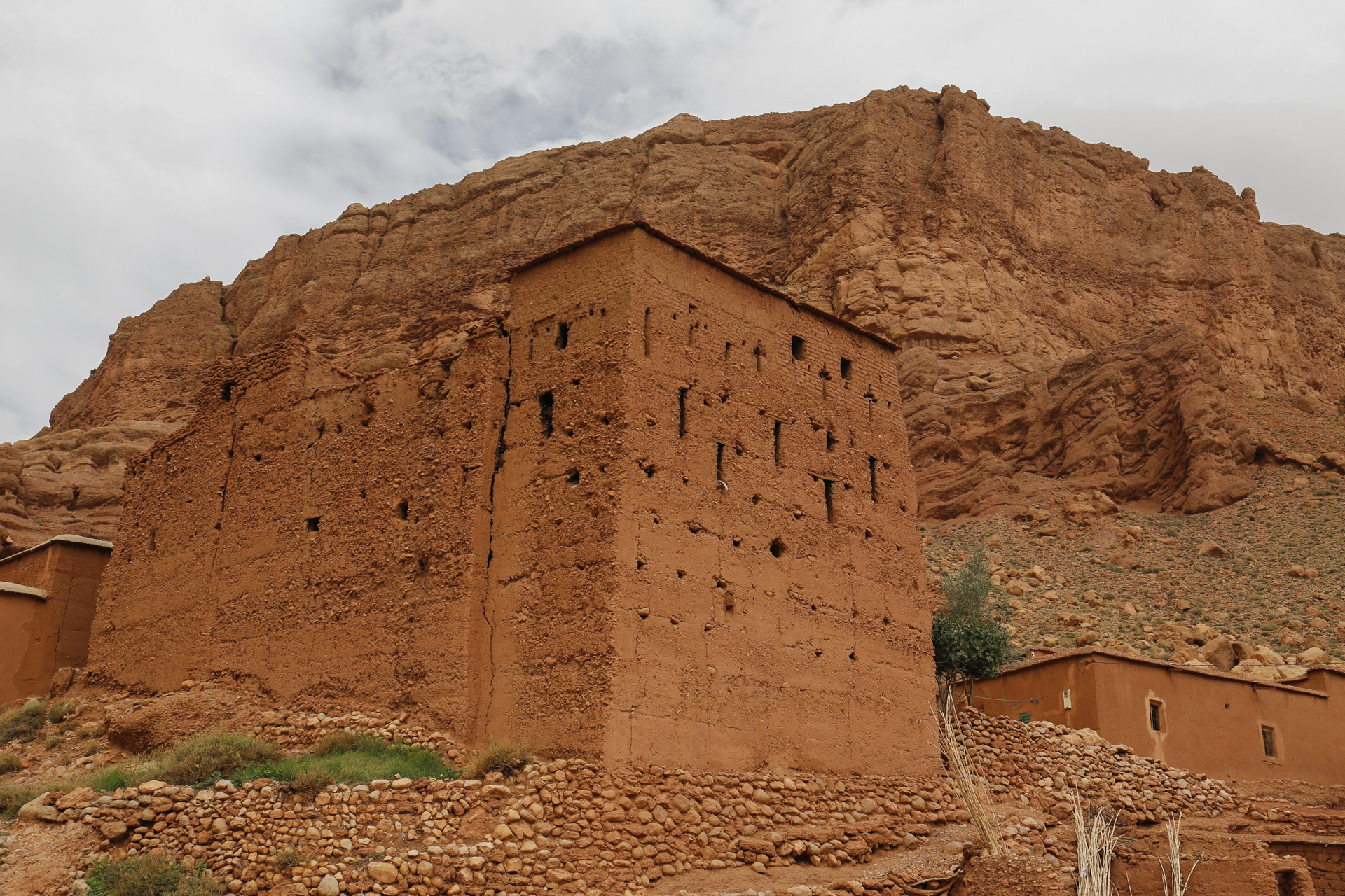 Kurz nach dem Aufbruch verließen wir den Bus schon wieder zu einer kleinen Wanderung in der Nähe der Wollsack-Formationen. Wir überquerten auf einer Brücke den Dades und liefen dann oberhalb der Vegetationszone im Bereich der Wohnbebauung. Dort fanden sich kleinere Kasbahs, aber auch renovierte Stampflehmhäuser. Und an einem Hang ein Friedhof. Der war allerdings kaum als solcher zu erkennen, weswegen mich unser Reiseleiter zurückpfeifen musste, weil ich angefangen hatte, den Hang hochzusteigen, um eine bessere Position zum fotografieren der Kasbah, an der wir gerade vorbeigekommen waren, zu erreichen. Erst bei genauerem Hinsehen war zumindest ein anscheinend relativ neues Grab zu entdecken. Die alten Friedhöfe haben keine sichtbaren Stelen oder Grabumfassungen. Der aufgeschüttete Grabhügel vergeht irgendwann und dann bleiben nichts als Steine.
