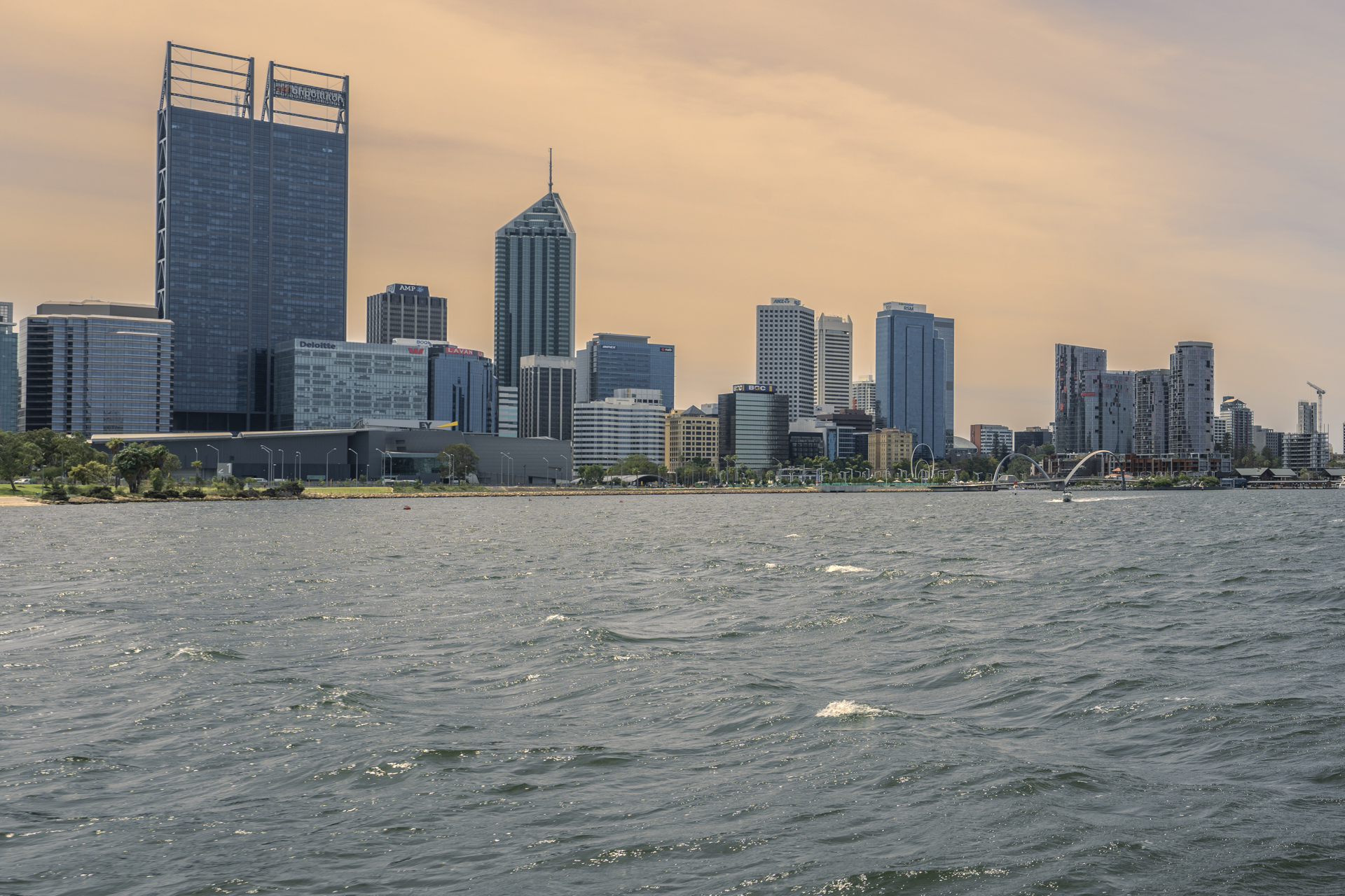 Auf dem letzten Stück vor Perth drehte der Kapitän auf und der Wind blies uns fast von Deck (na ja, ganz so schlimm war es nicht). Die Skyline von Perth lag nun, kurz vor Mittag, leider im Gegenlicht, so dass die Aufnahmen später entweder gerettet oder entsorgt werden müssten.