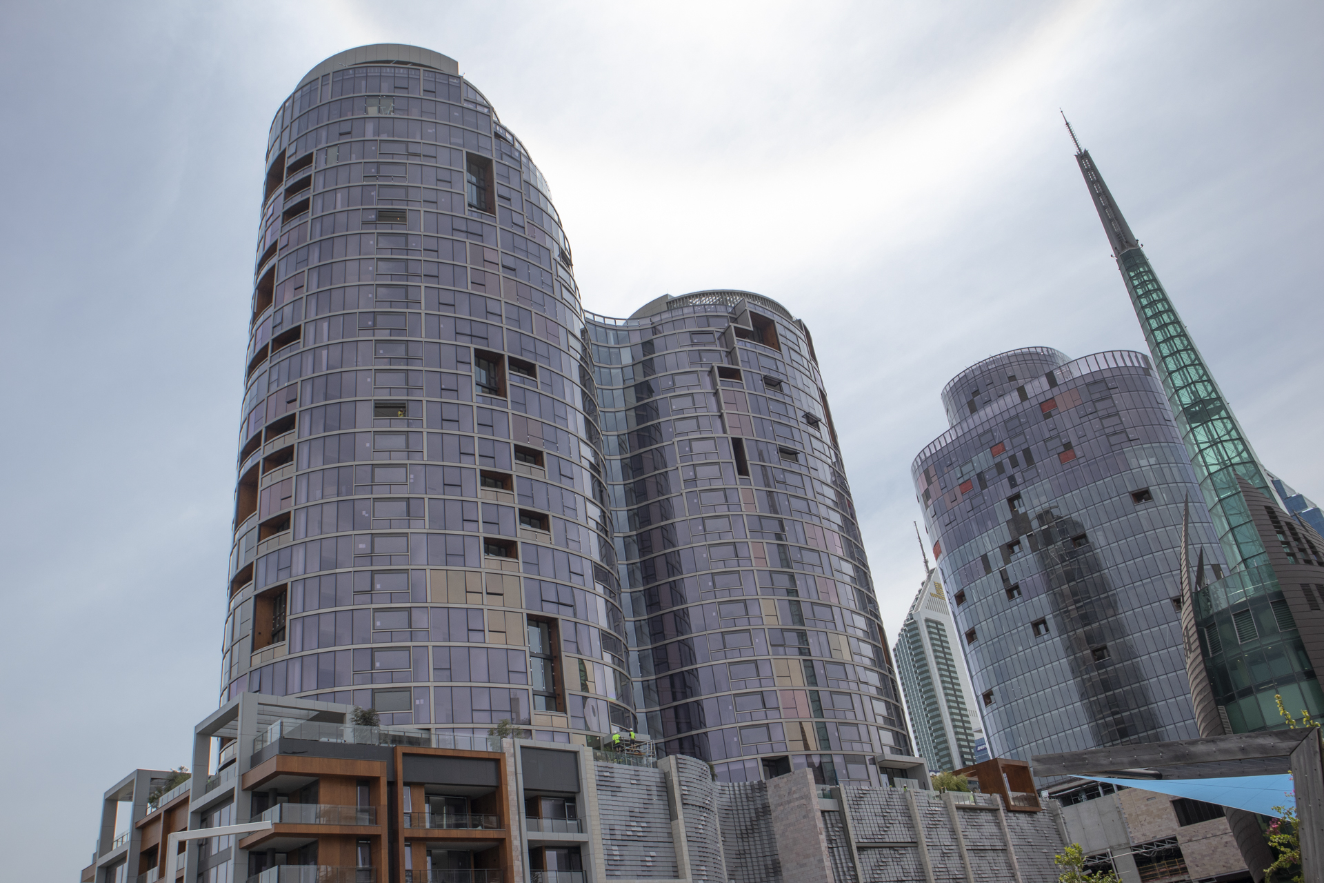 Direkt an der Anlegestelle fielen der etwas futuristische Bell Tower, der eher wie eine himmelwärts strebende gläserne Kapelle aussah, und die noch in den letzten Bau-Zügen befindlichen ovalen Doppeltürme eines neuen Appartement- und Hotelkomplexes ins Auge.