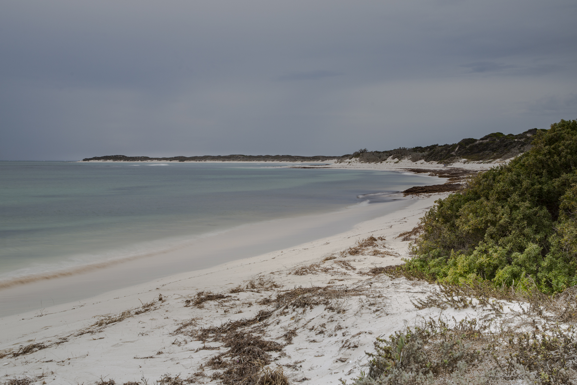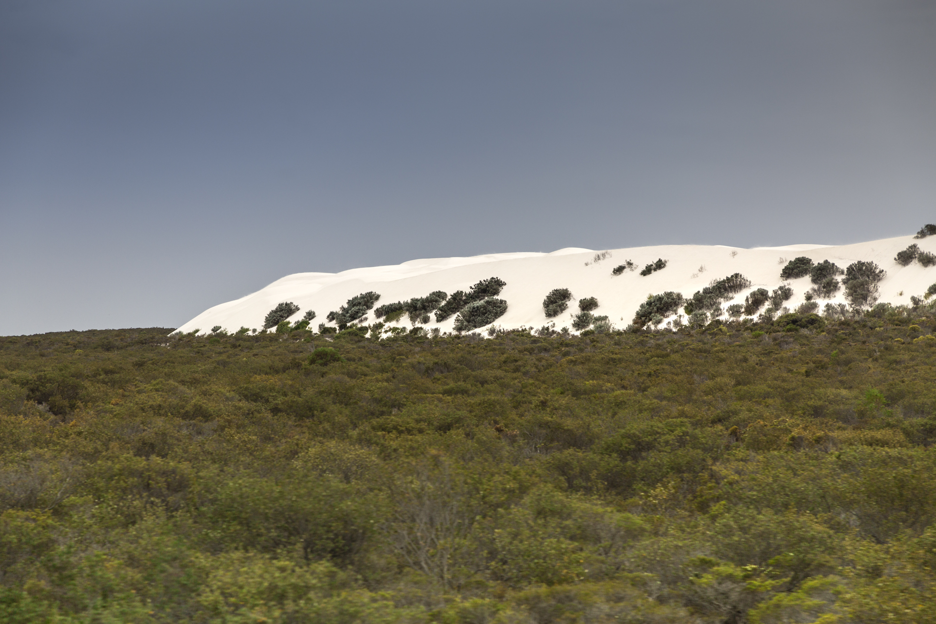 Nach zwei Stunden Fahrt und einem Nickerchen machten wir Pause in dem verschlafenen Nest Lancelin. Die Landschaft war nach wie vor leicht hügelig mit sehr niedrigem Buschwerk. Dazwischen schimmerte der Dünensand hervor. Näher zur Küste sehr weiß, weiter ins Landesinnere dann eher beige bis gelblich.